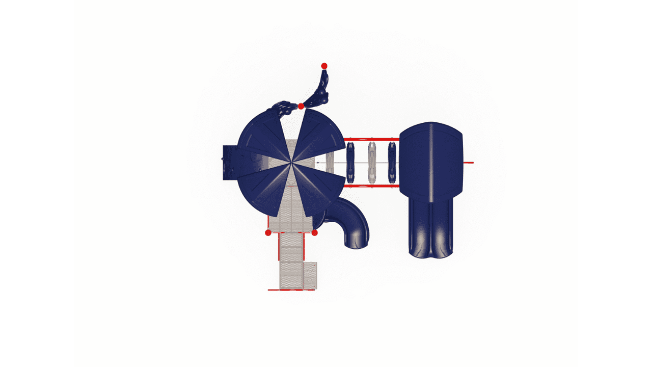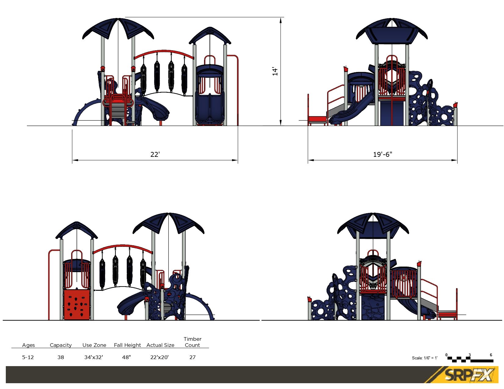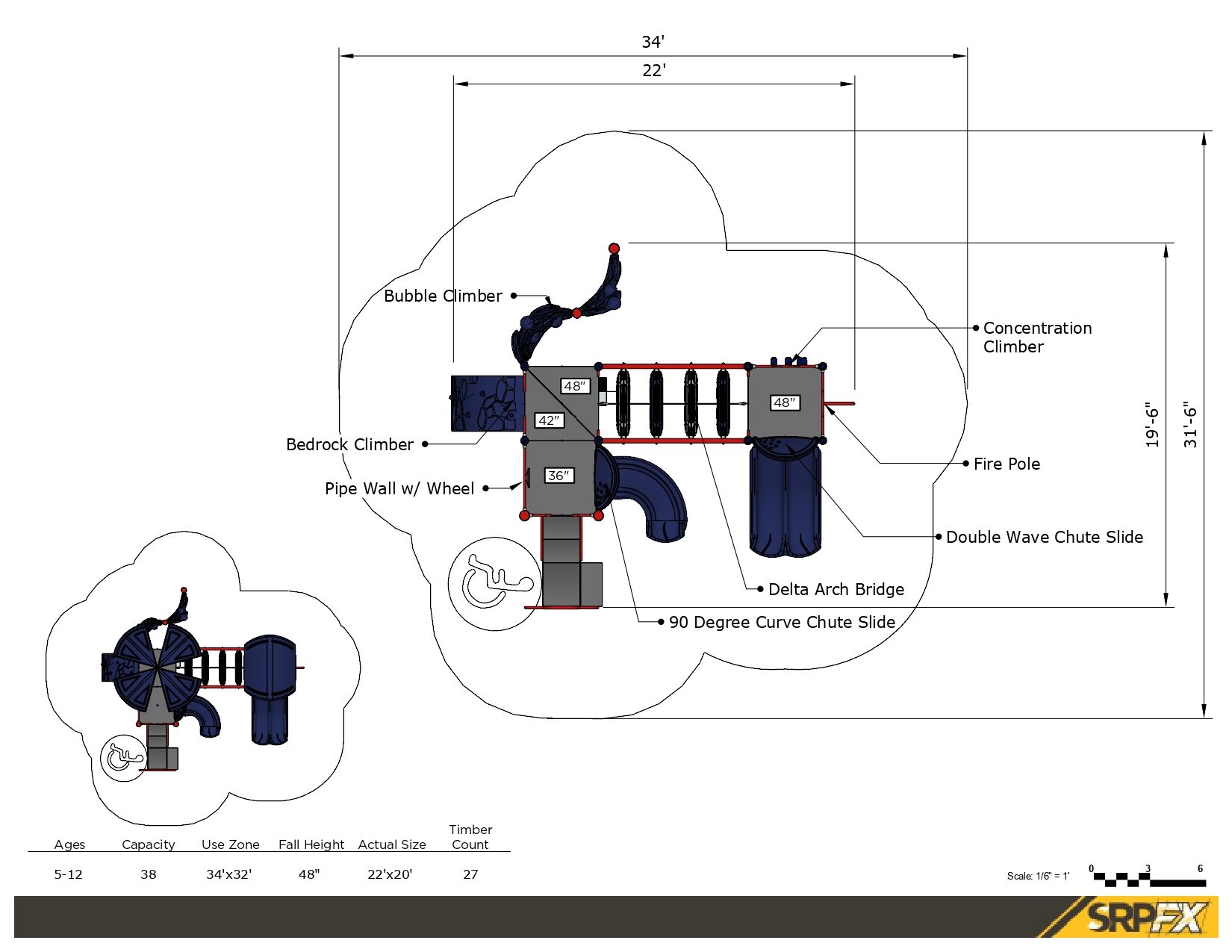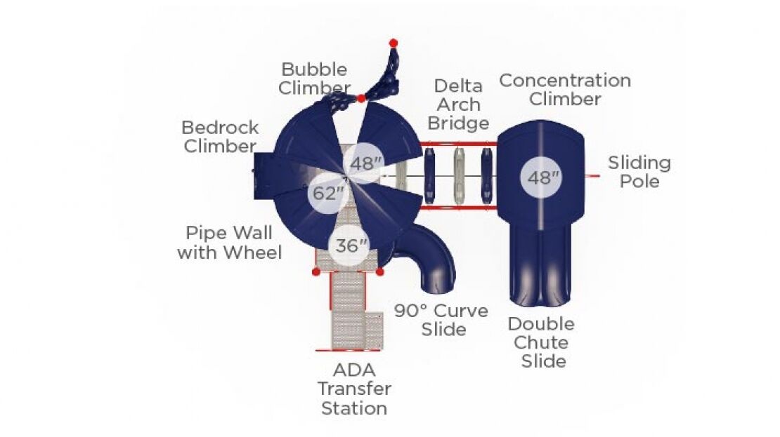 Upholding a sleek and modern look, this commercial playground structure will have children using every muscle in their body. As an alternative to basic playground steps, the delta arch bridge provides children a unique climbing challenge and invites children to work together in order to navigate their way through this structure. The double chute slide and the 90-degree curve slide will surely put a smile on a child’s face! Additionally, this structure comes with a sliding pole for them to move, in a unique and fun way, from the decking back down to the ground. The 22 feet by 20 feet structure has a required use zone of 34 feet by 32 feet and has a capacity to fit 38 children between the ages of 5 and 12.