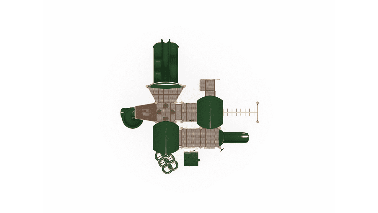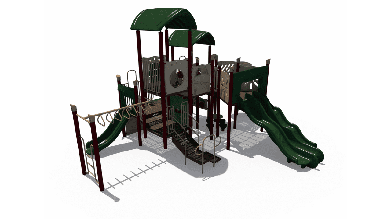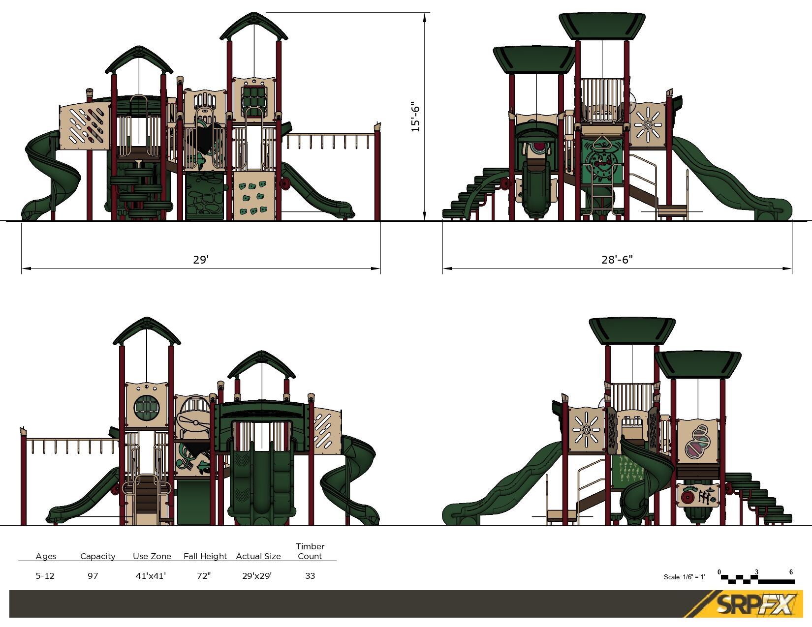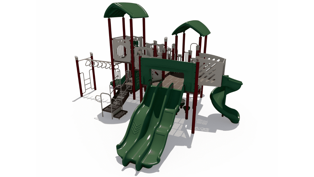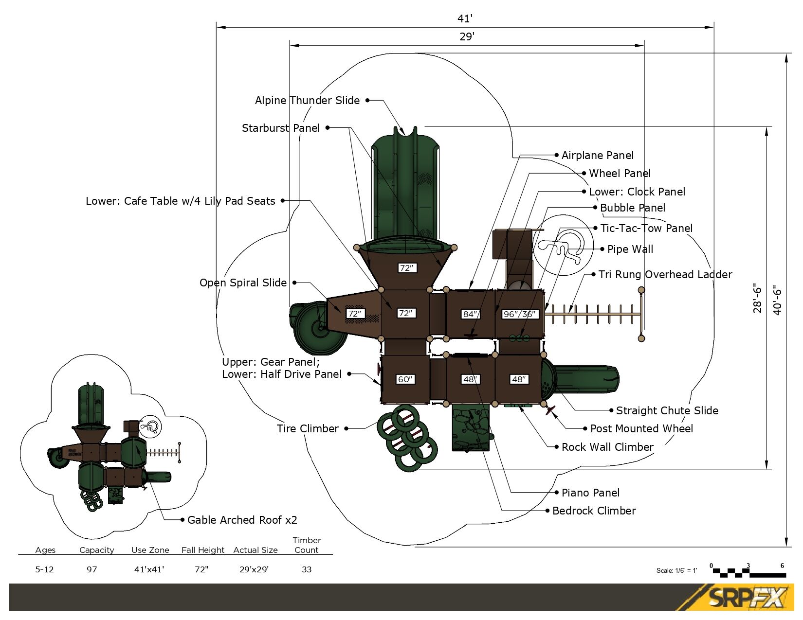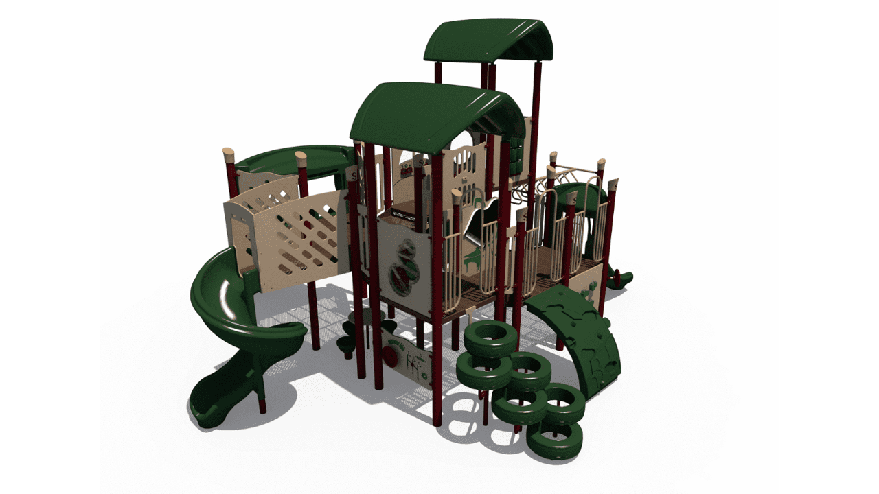 The PS5-70241 commercial play structure is set to transform your area into a joyful play place. Featuring alpine thunder slides, a café table and seats, an open spiral slide, gear and half drive panels, and so much more, the structure will have children building muscles and excitement! The bedrock and tire climber is the structure’s unique way of inviting children onto the deck where they can continue exploring play activities. With a required use zone of 42 feet by 42 feet, the structure’s overall size is 30 feet by 30 feet and comfortably accommodates 56 children aged from 5-12 years.