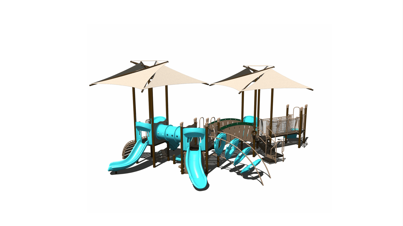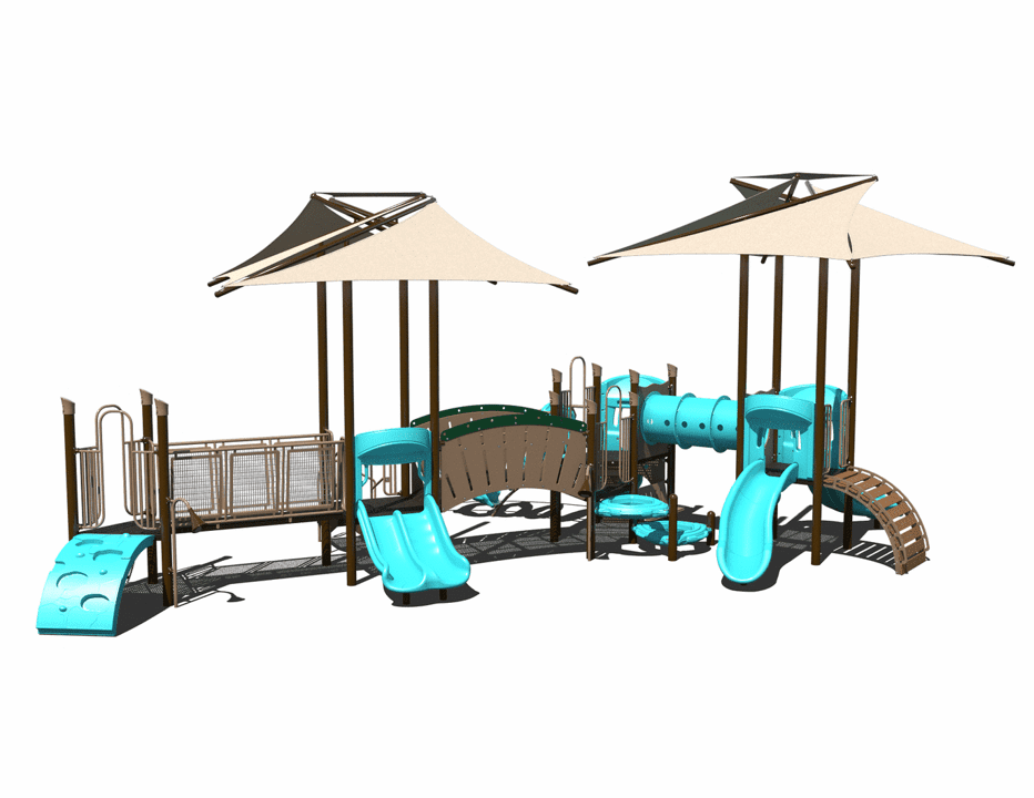 The PS5-72553 is a commercial steel playground designed for children ages 2-5. It is designed with an integrated shade, slides, climbers, and play panels that add great play value to schools or parks.