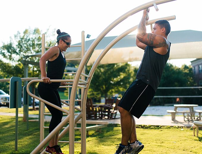 Our Pull-Up and Dip Station is great for any outdoor gym. It’s designed with two sides: the pull-up bar targets biceps while the dip station targets triceps.