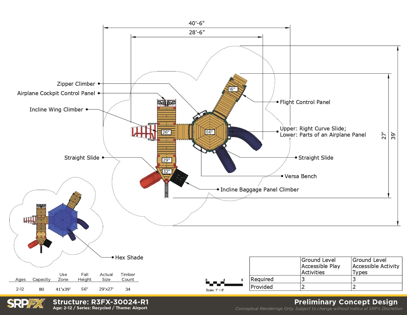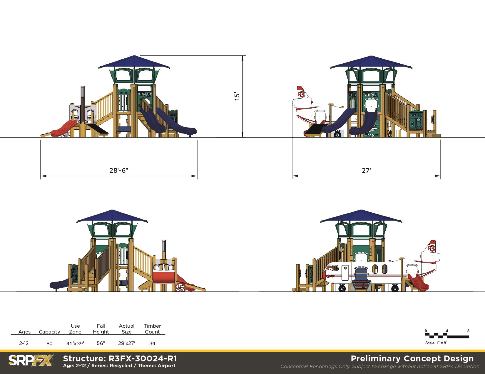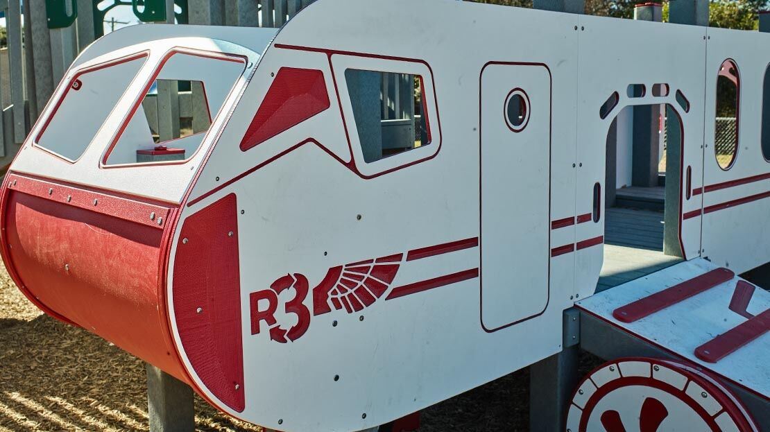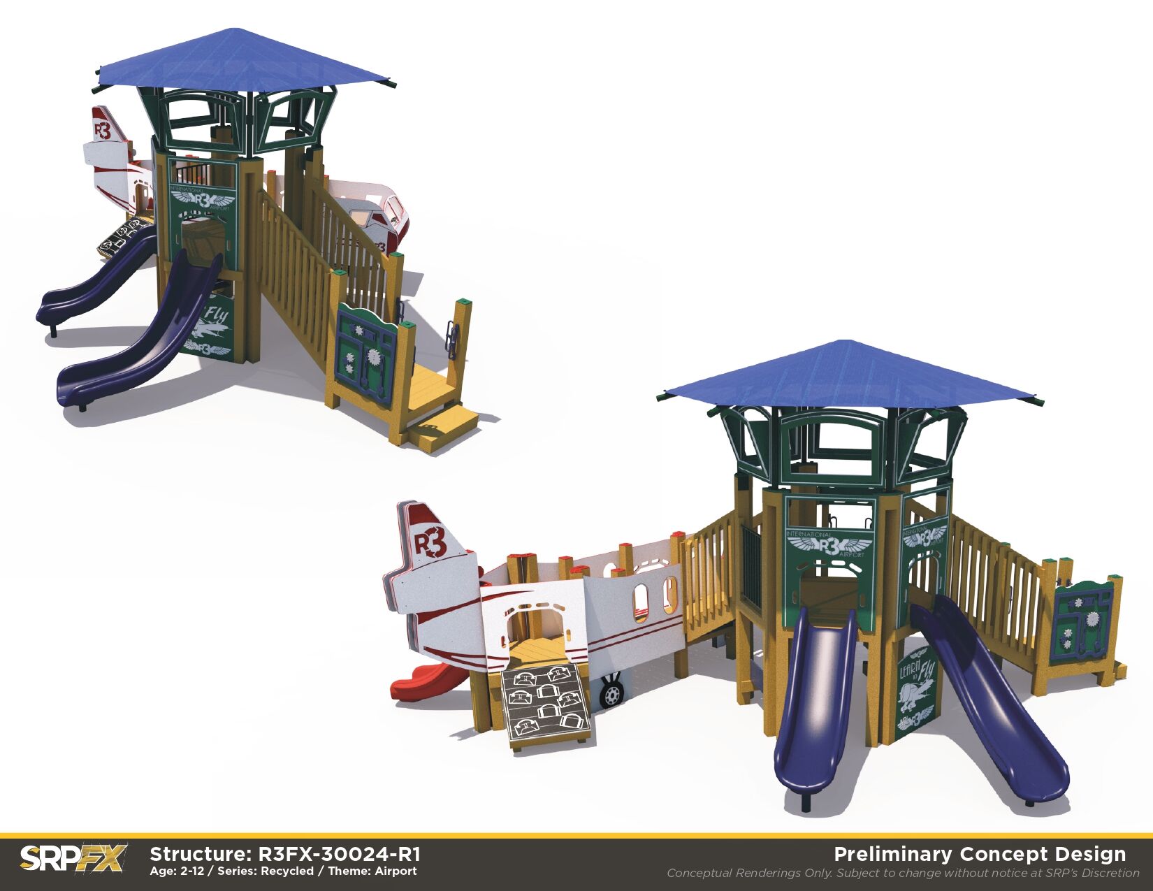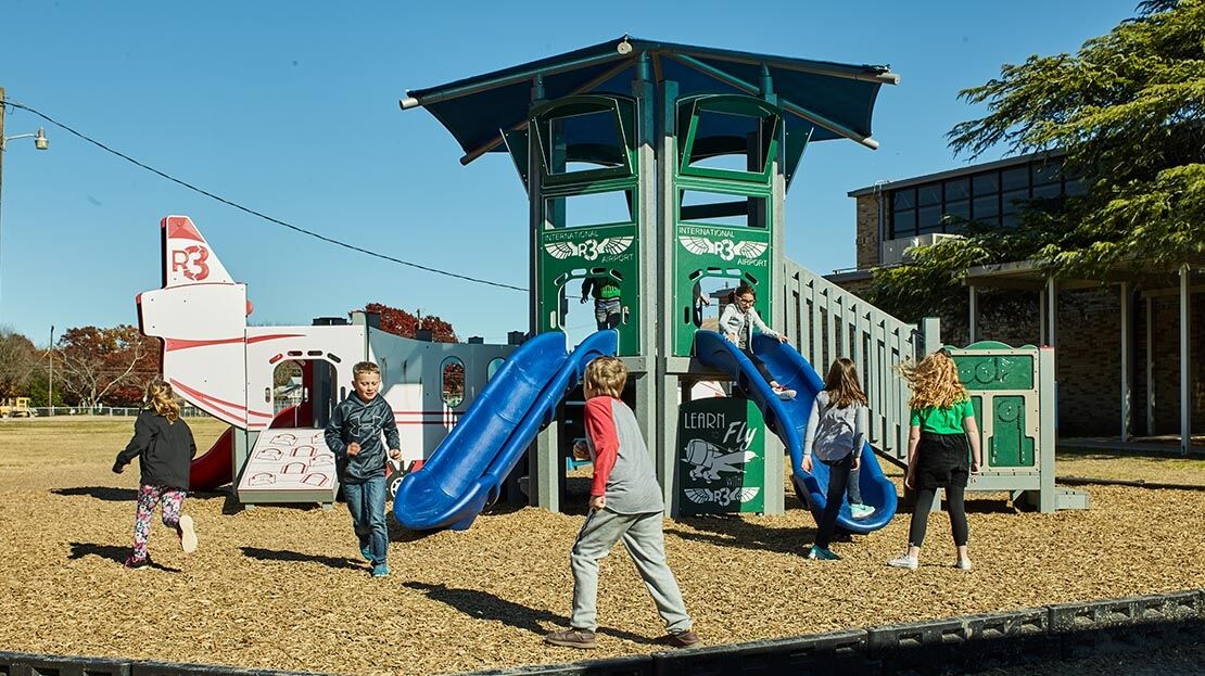 The international airport-themed recycled play structure combines environmentally-friendly design elements with a number of educational panels to teach children ages 5-12 all about airplanes and airports. An airplane façade with crawl through panels sets the stage for themed play, inviting children to climb onto the plane and slide out on the double-wall slide. The parts of an airplane panel and education climber help to engage young minds. For those girls and boys who don’t wish to fly the plane as a pilot, they can simply climb the steps and enter the control tower where they can guide planes safely toward their international destinations. Some additional features like the inclined wing climber, zipper climber, and versa bench make this an ideal choice for a school playground.