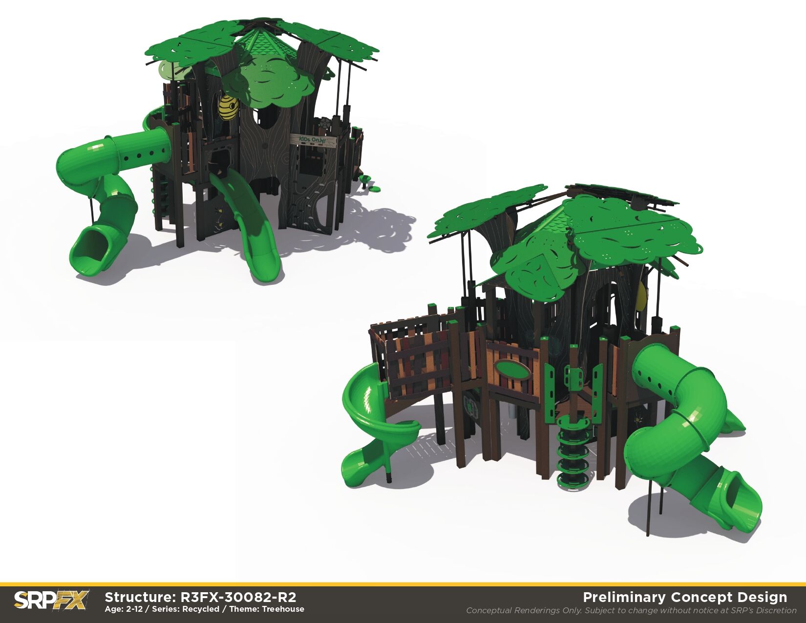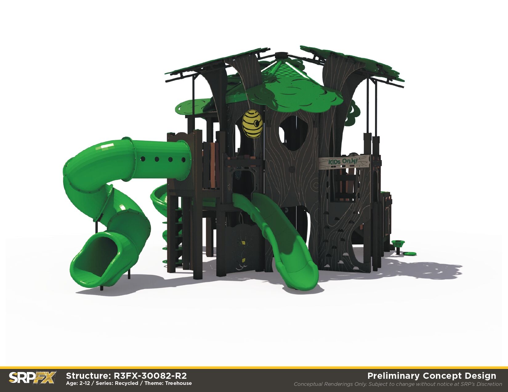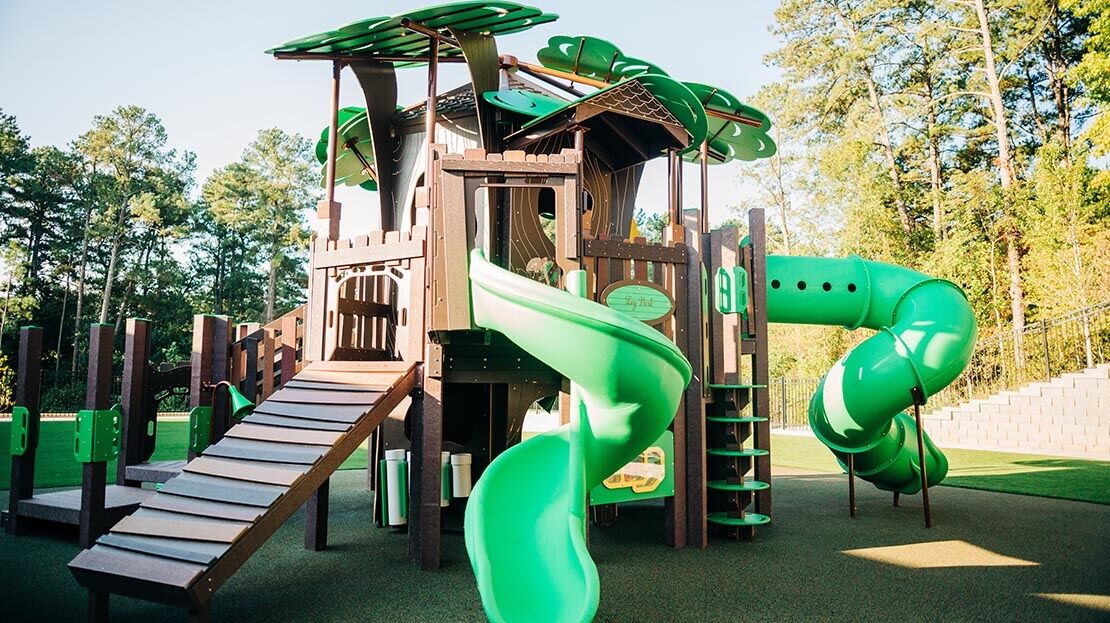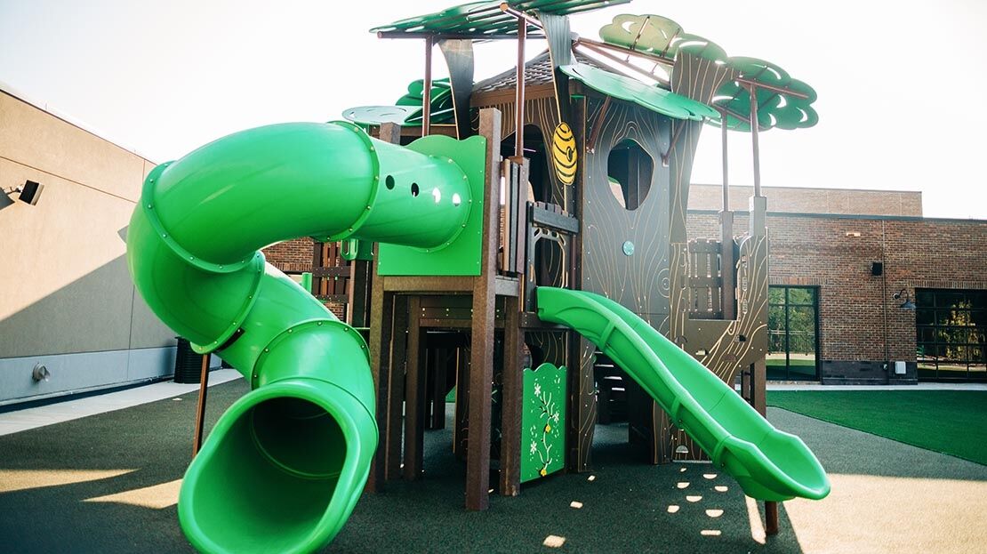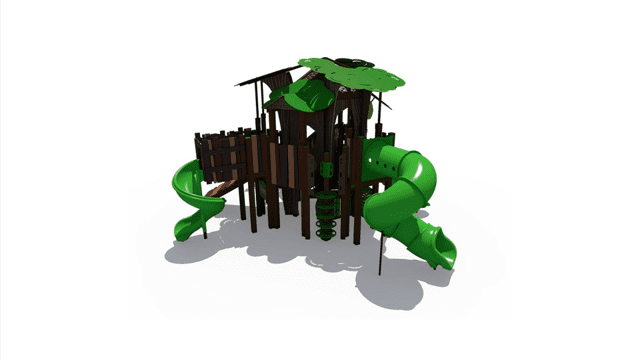 Our Treehouse Themed Playground is a customer favorite for a variety of commercial playgrounds, including parks and family centers. Children (and their parents!) will be in awe of the details found within this structure, in addition to the various slides and themed climbing components. This structure features musical, physical, and dramatic play elements that are all tied together with a beautiful natural color scheme. What’s more, the structure itself is almost fully shaded from the sun through the tree canopy top.
