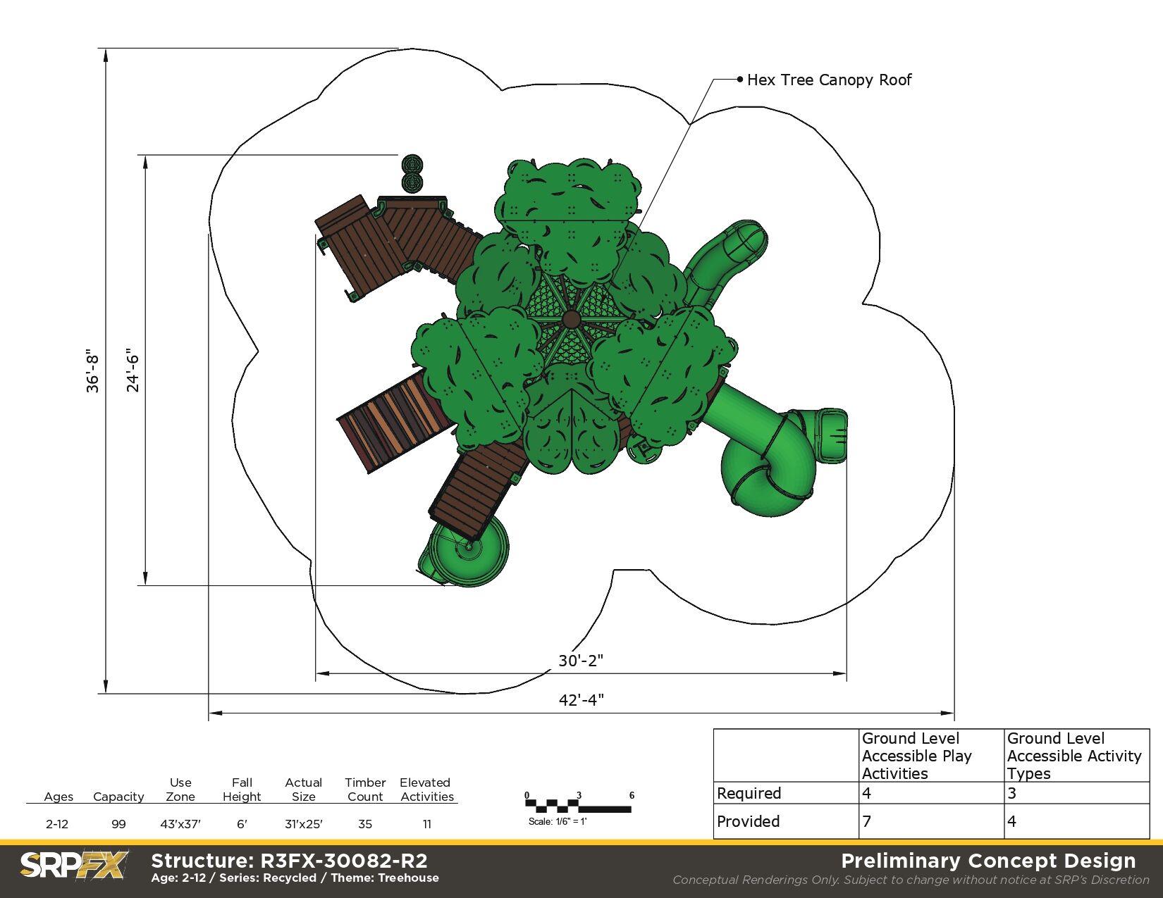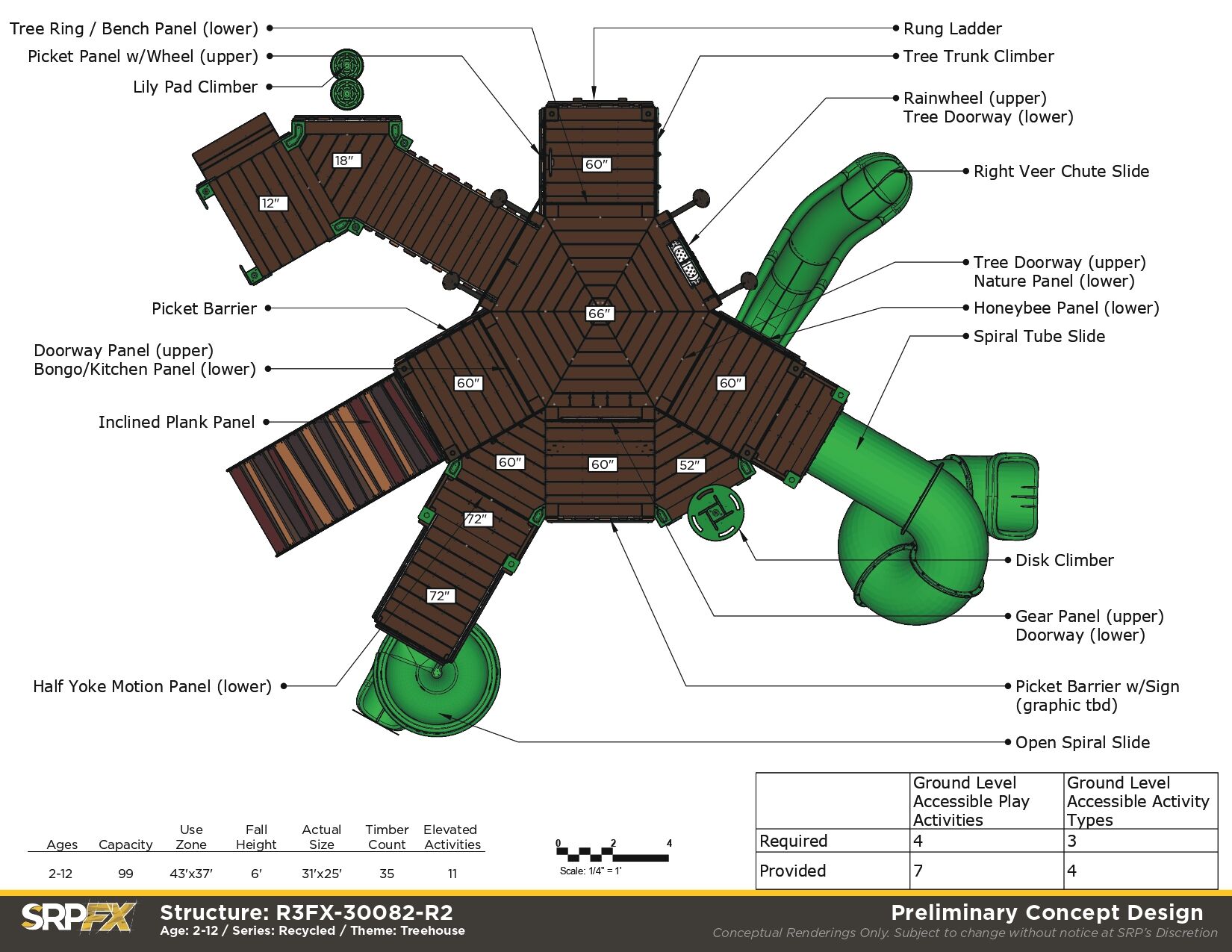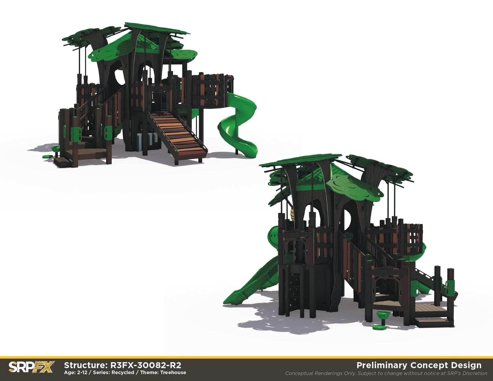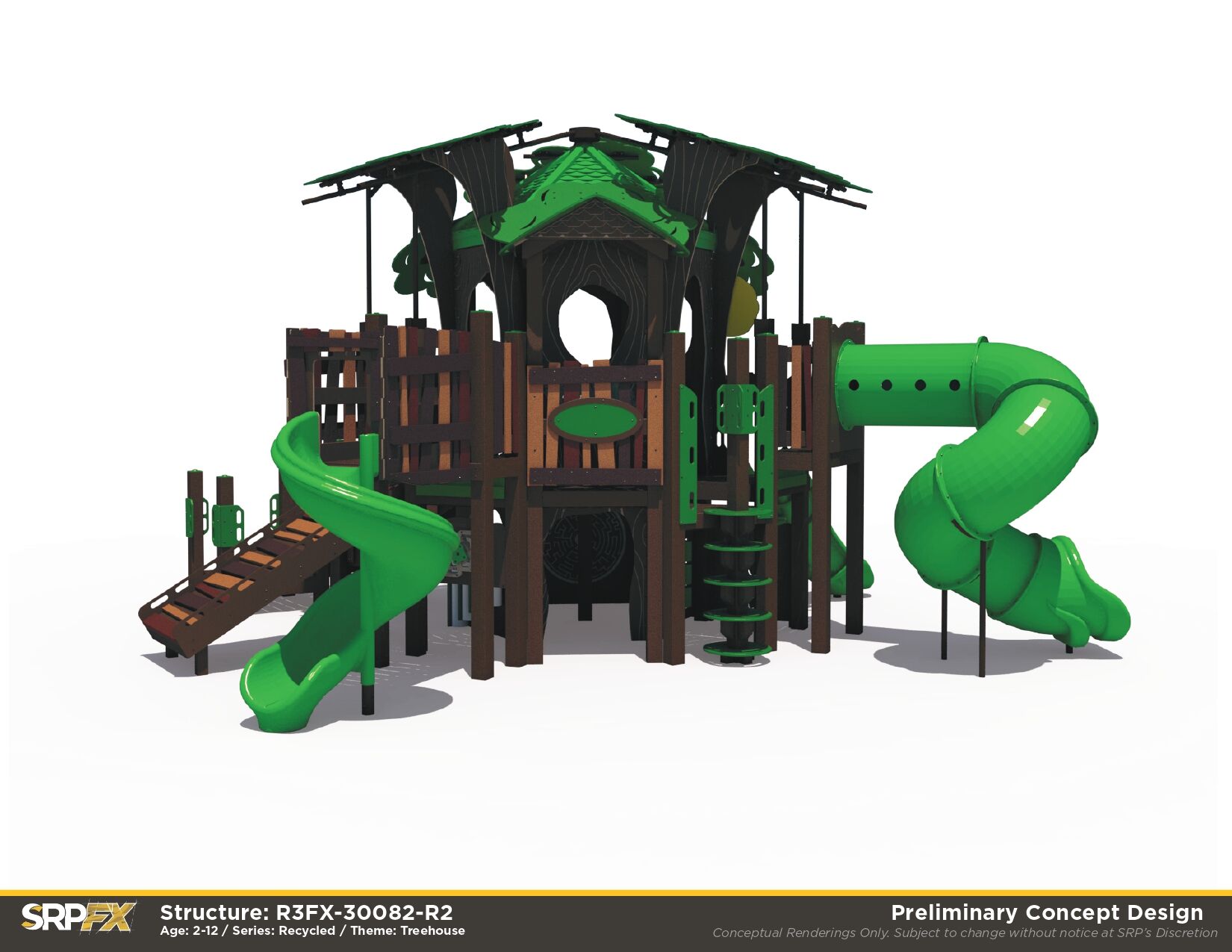 Our Treehouse Themed Playground is a customer favorite for a variety of commercial playgrounds, including parks and family centers. Children (and their parents!) will be in awe of the details found within this structure, in addition to the various slides and themed climbing components. This structure features musical, physical, and dramatic play elements that are all tied together with a beautiful natural color scheme. What’s more, the structure itself is almost fully shaded from the sun through the tree canopy top.