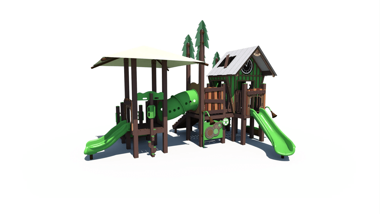 The RFX-30169 is part of our R-Town® Cottage series of fun and whimsical playground structures. This play unit includes 3 slides, a crawl tunnel, climbers, and interactive panels. It’s designed with an integrated shade to protect equipment and children from harmful UV rays.