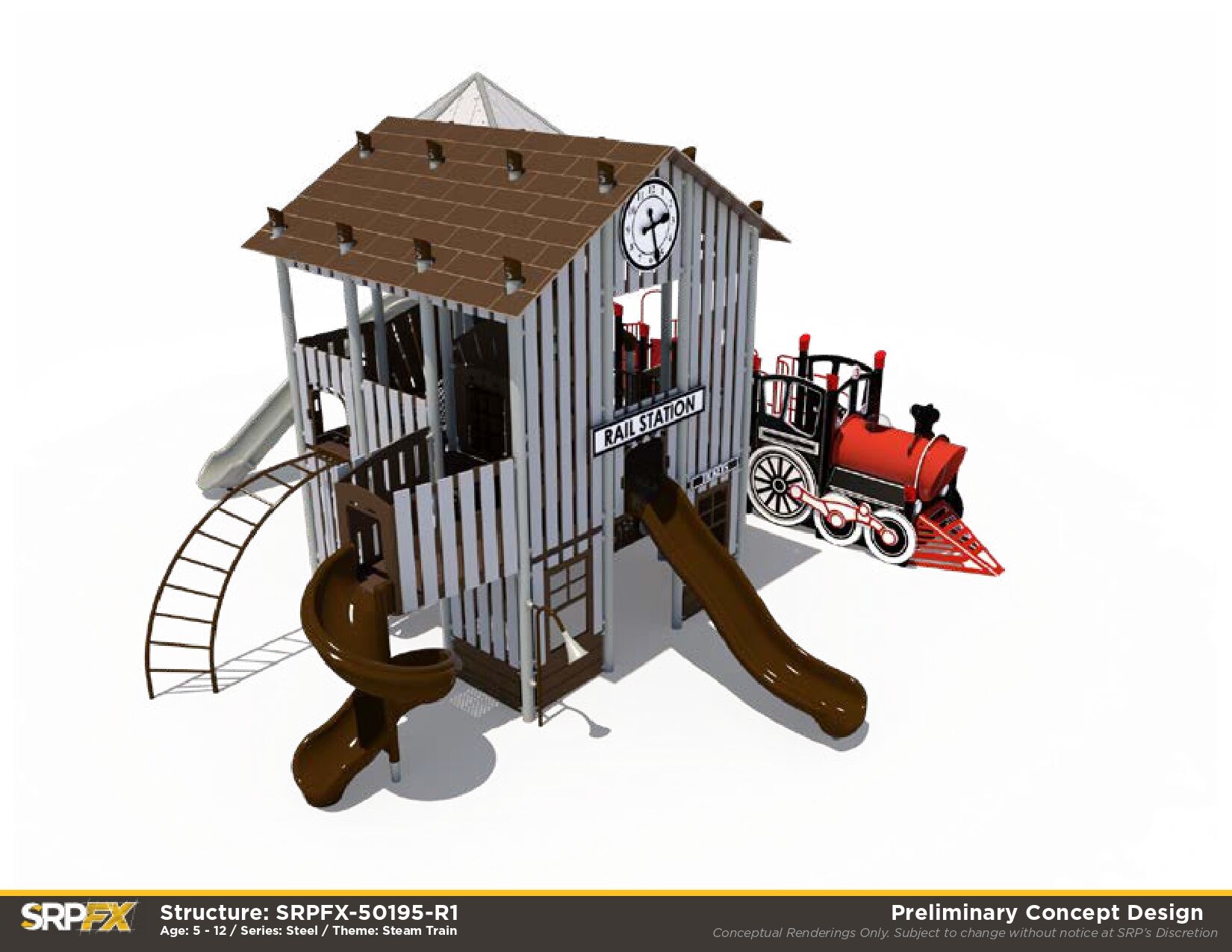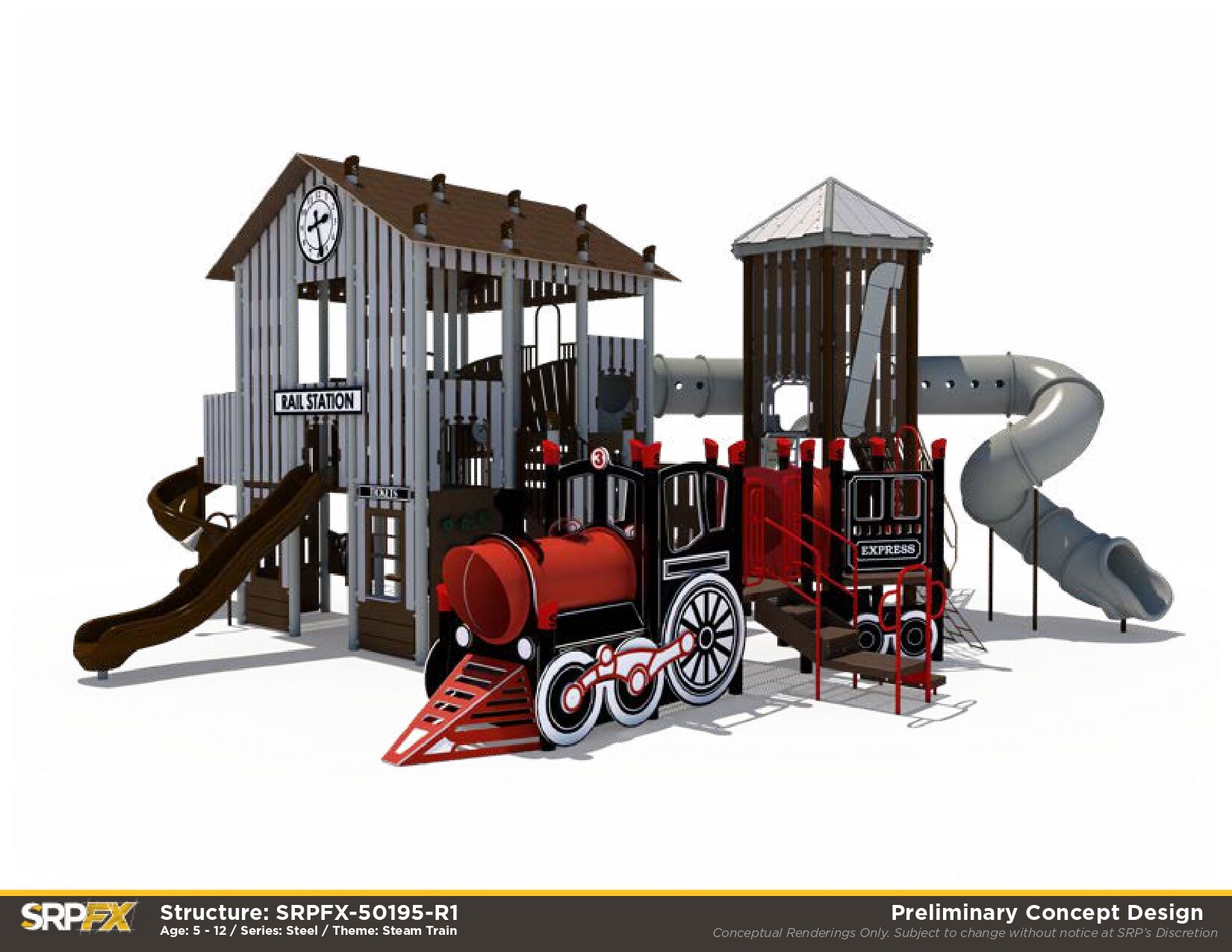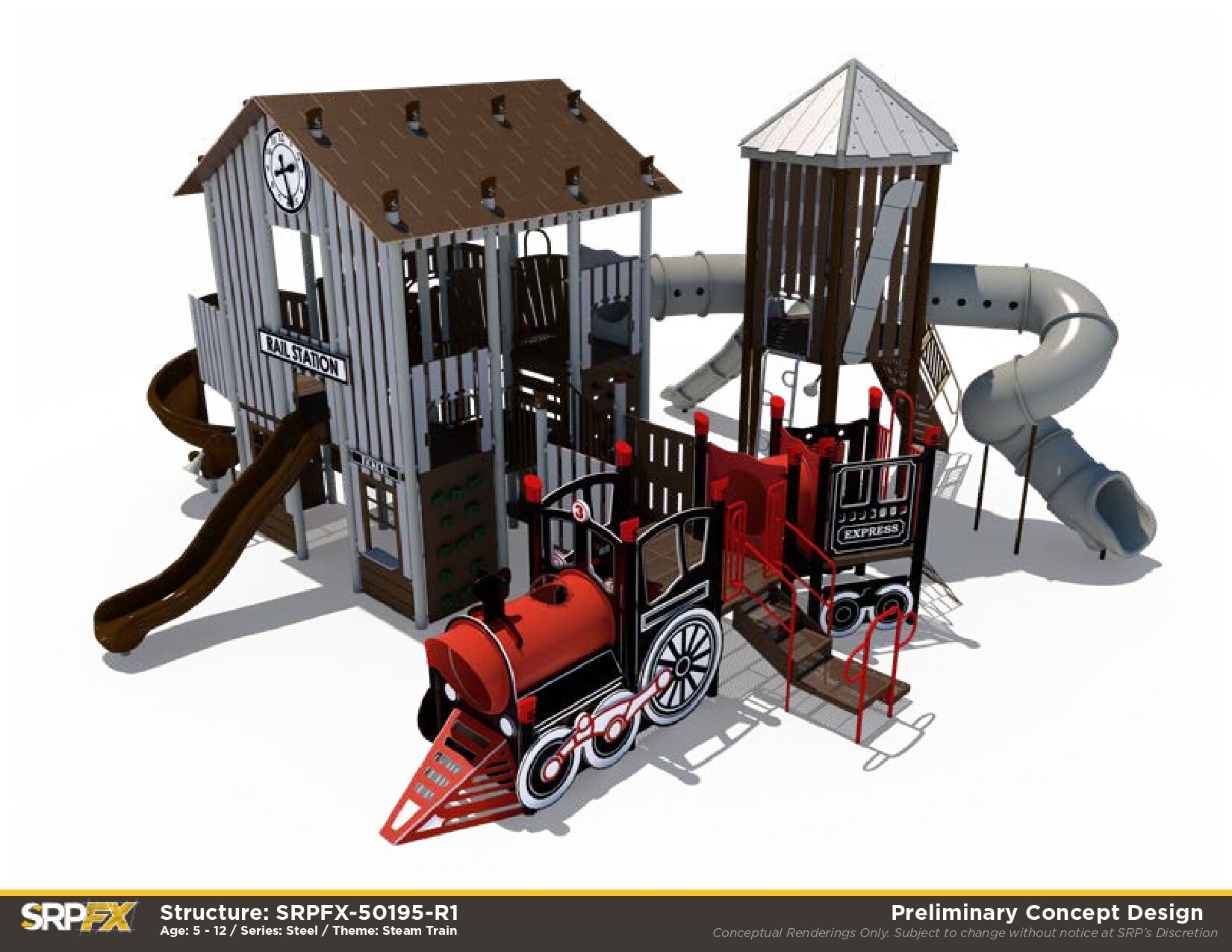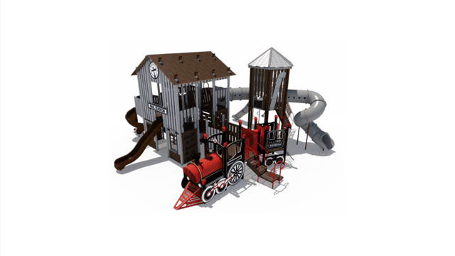 All aboard! First top: fun! The Rail Station Themed Playground makes a great addition to any outdoor play space. Children will love exploring the many climbers, panels, and slides this train-themed playground has to offer.