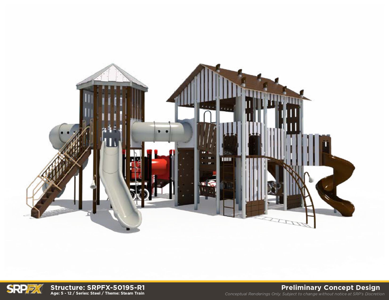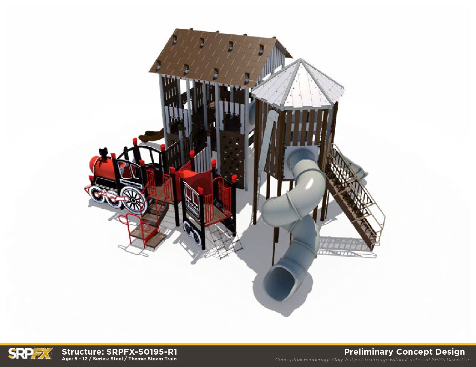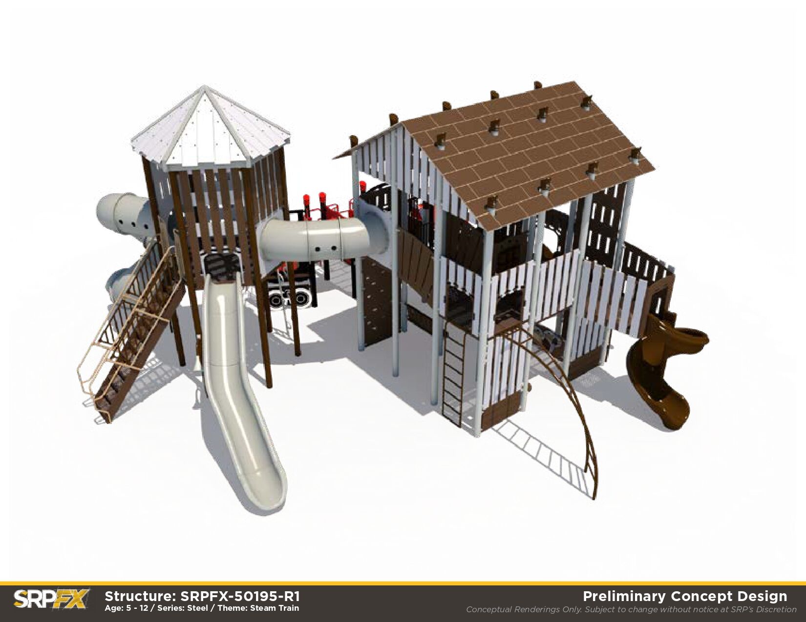 All aboard! First top: fun! The Rail Station Themed Playground makes a great addition to any outdoor play space. Children will love exploring the many climbers, panels, and slides this train-themed playground has to offer.
