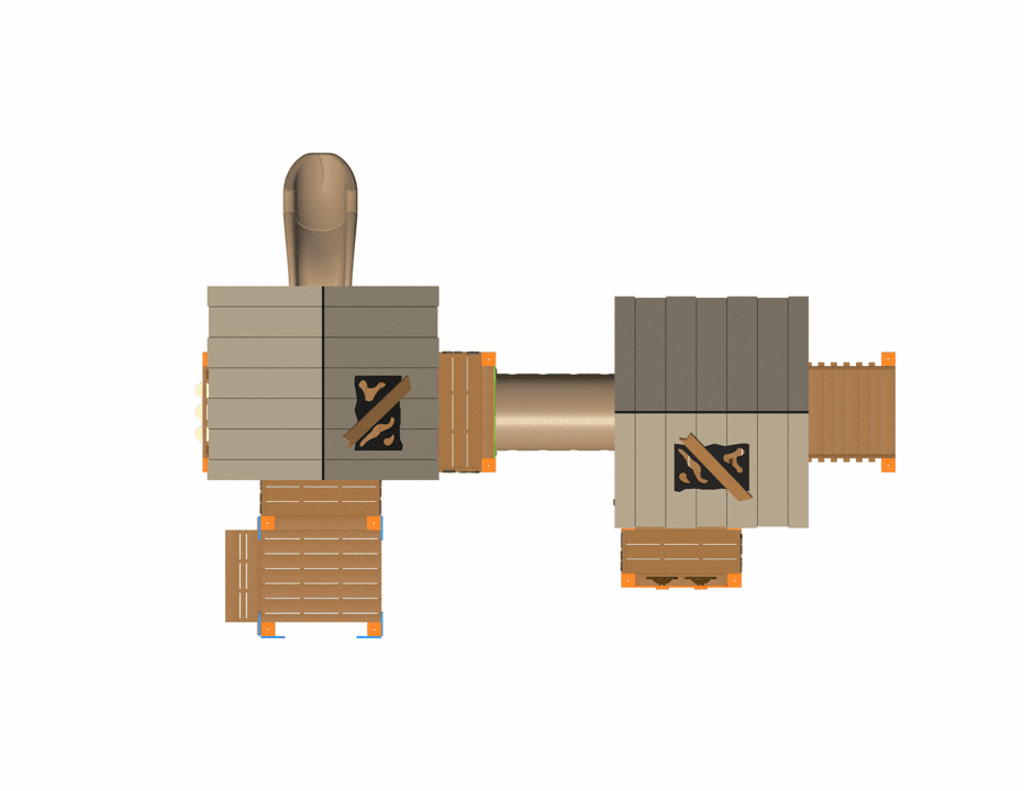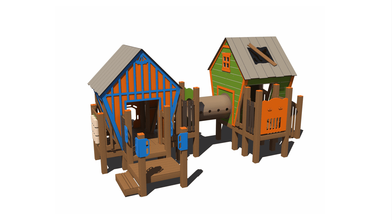 The RFX-30187 is part of our collection of R-Town Cottages. This playground features two whimsical cottages connected with a crawl tunnel. Children ages 2-5 will love exploring the fun slides, climbers, and interactive play panels on this play structure.