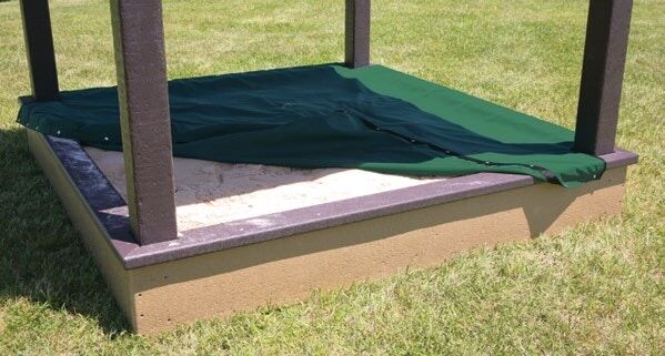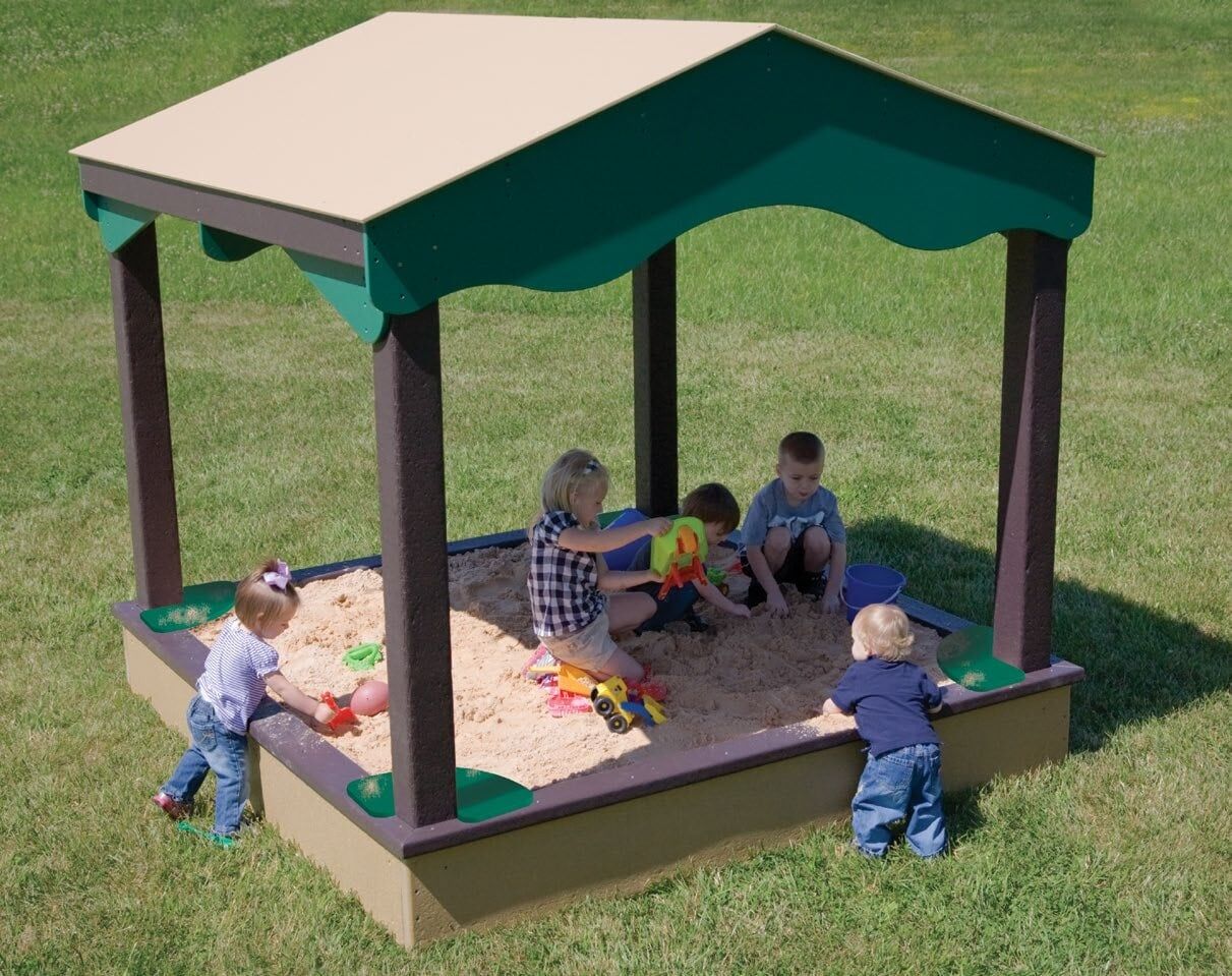 Kids can play all day, in the shade! Whimsical curvy roof covers a 12”High sandbox. Includes 4 corner seats and optional cover for debris-free fun. Durably constructed from RSP™.