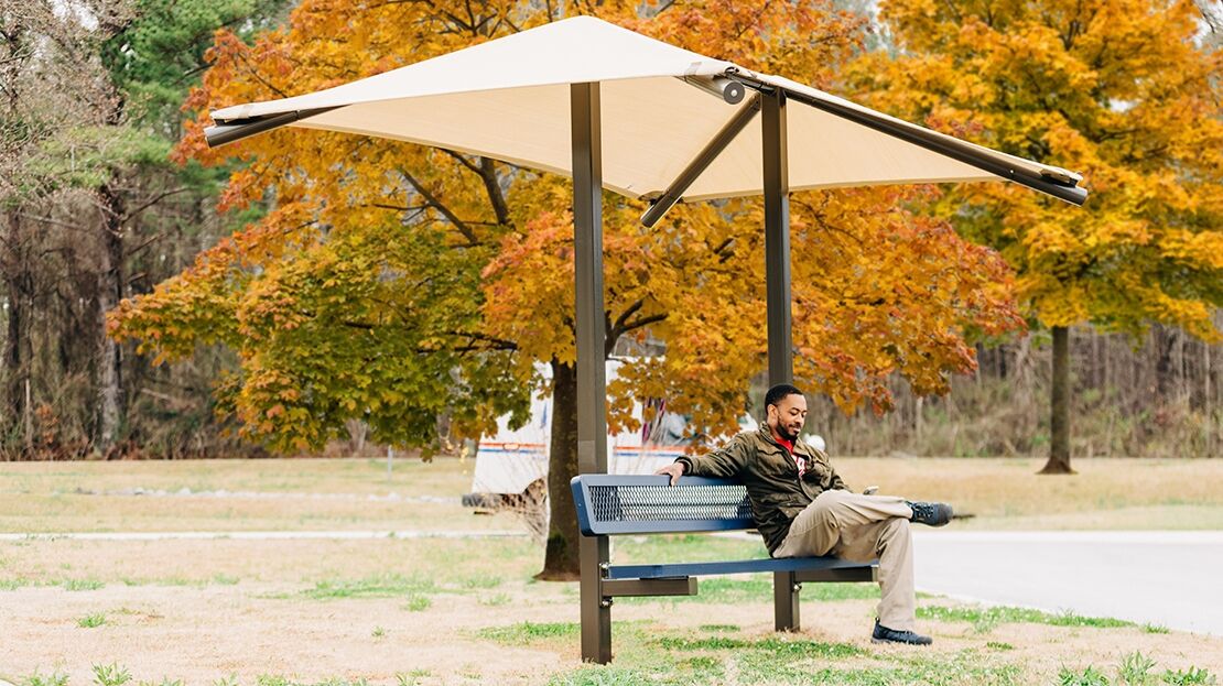 The Shaded Bench provides a great place to rest with the comfort of a shade. It combines our 8-foot Regal bench with a 12.5′ x 8′ integrated shade. The integration of shade into benches not only enhances the comfort of the seating experience but also promotes sun protection and helps prevent sunburn or overheating, especially during hot and sunny days.