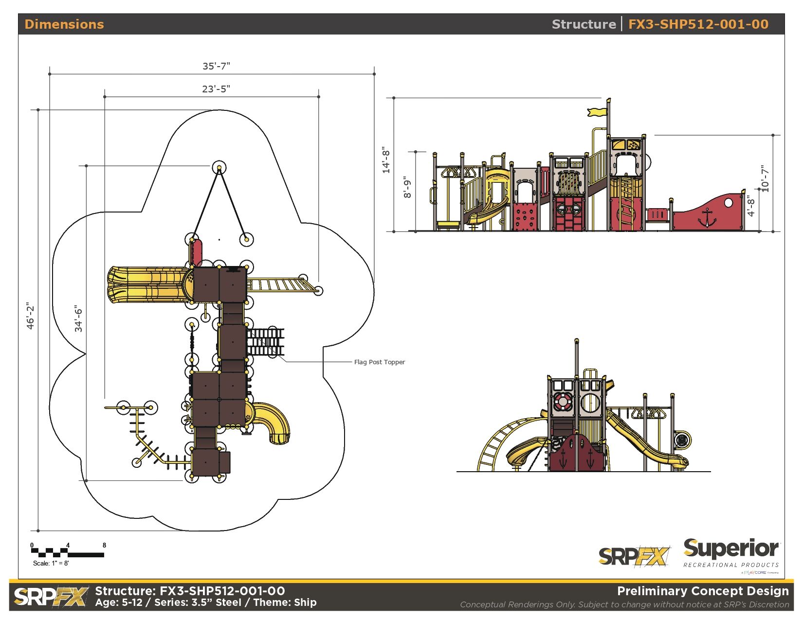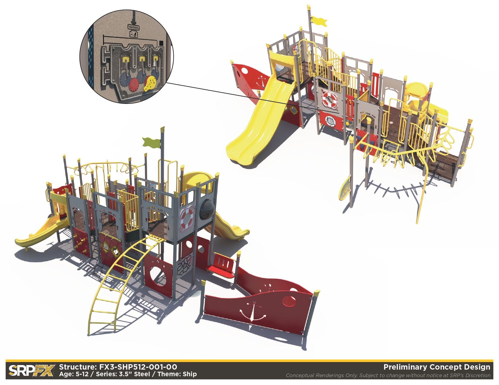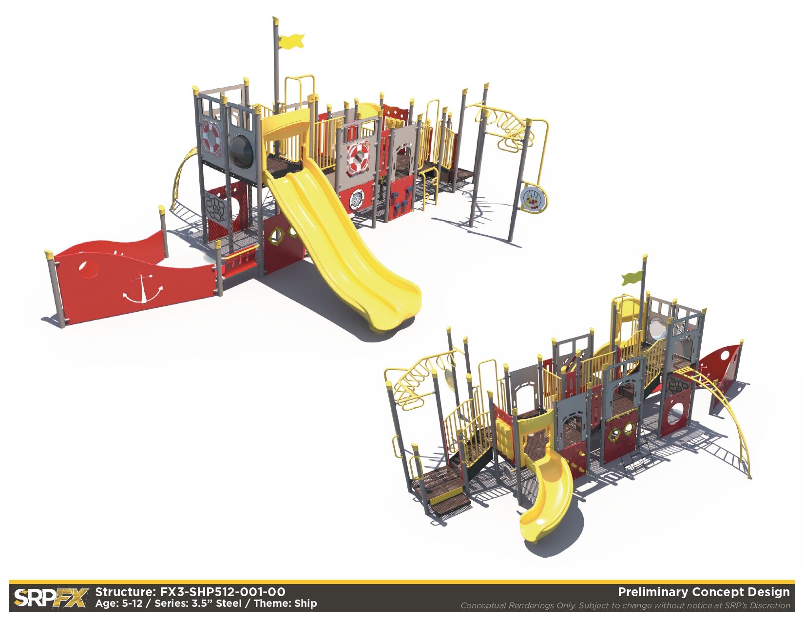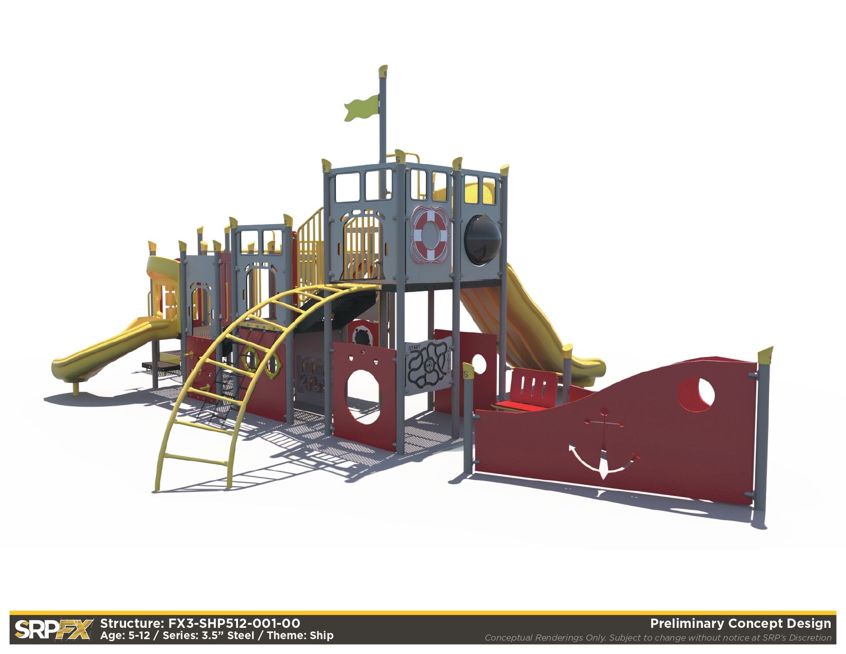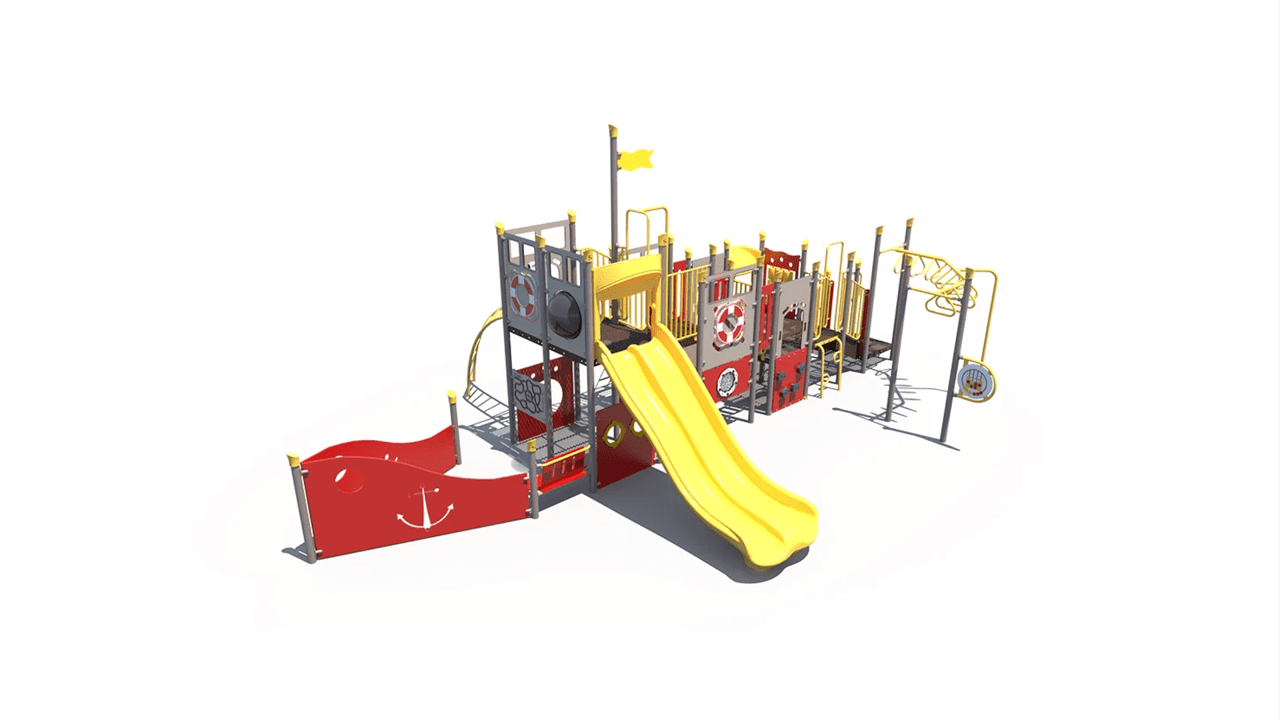 The FX3-SHP512-001 ship themed playground will add an iconic feature to your play space. This 3.5-inch post themed play structure adds great play value with its many slides, climbers, and panels. It’s designed for children ages 5-12.