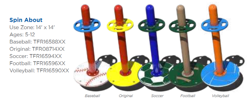 The Spin-About provides a fun activity for children to enjoy on the playground. By using a pulling motion to operate, this structure promotes muscle development and provides a unique experience for children. With themed options and a use zone of 14 ft. x 14 ft., this component is great for any environment.