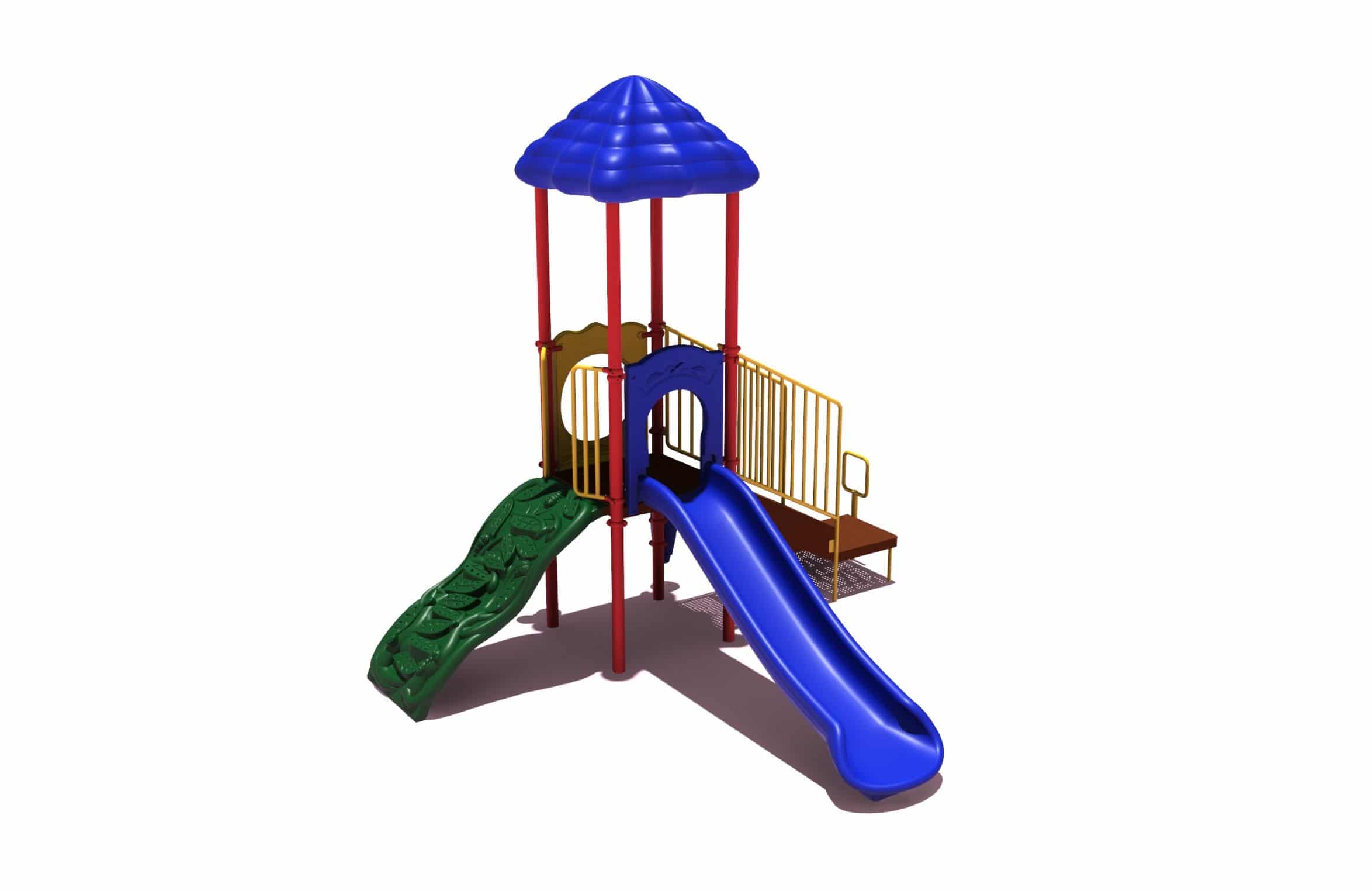 The most fun you’ll find in a one deck structure! The South Fork boasts a challenging 4′ Vine Climber and an exciting 4′ Straight Slide. The Window Panel adds sensory play while giving caregivers increased visibility to the structure. Three ground level music components ensure that children of all abilities will enjoy this structure. Finally, the nature-themed roof helps keeps kids cool as they explore the South Fork.