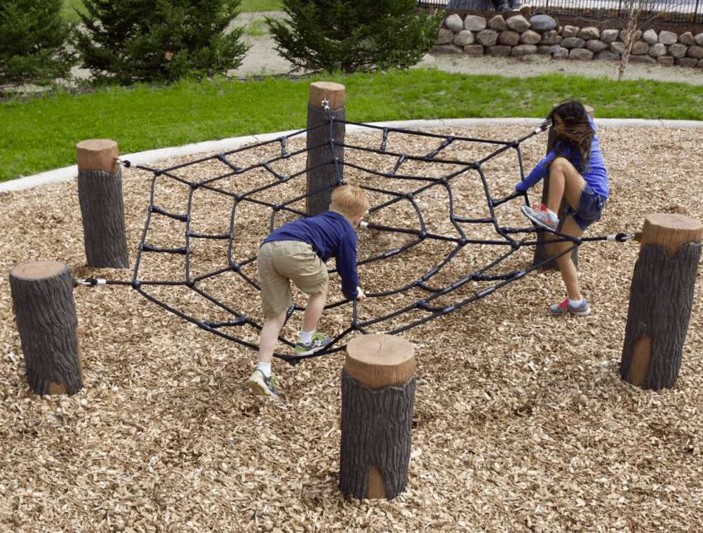 Our giant Spider Web Climber held up with Log Stumps allows kids to scale across the web like a giant insect. Crawl across the top or dangle from the bottom as you discover all the fun ways to play on this climber!