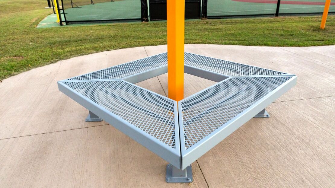 A commercial steel tree bench is a type of outdoor seating specifically designed to encircle a tree trunk. It serves as both a functional seating solution and a decorative element in parks, gardens, or other public spaces. Our popular Geometric Bench is constructed using a classic 3/4″ #9 expanded steel, which provides durability and stability. This unique bench comes in 72 in. and 96 in. lengths. For mounting, both in-ground and surface mounting options are available. This seat style can also be placed around pillars and planters or used as a bench on its own.