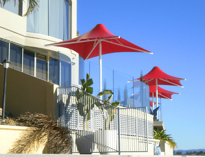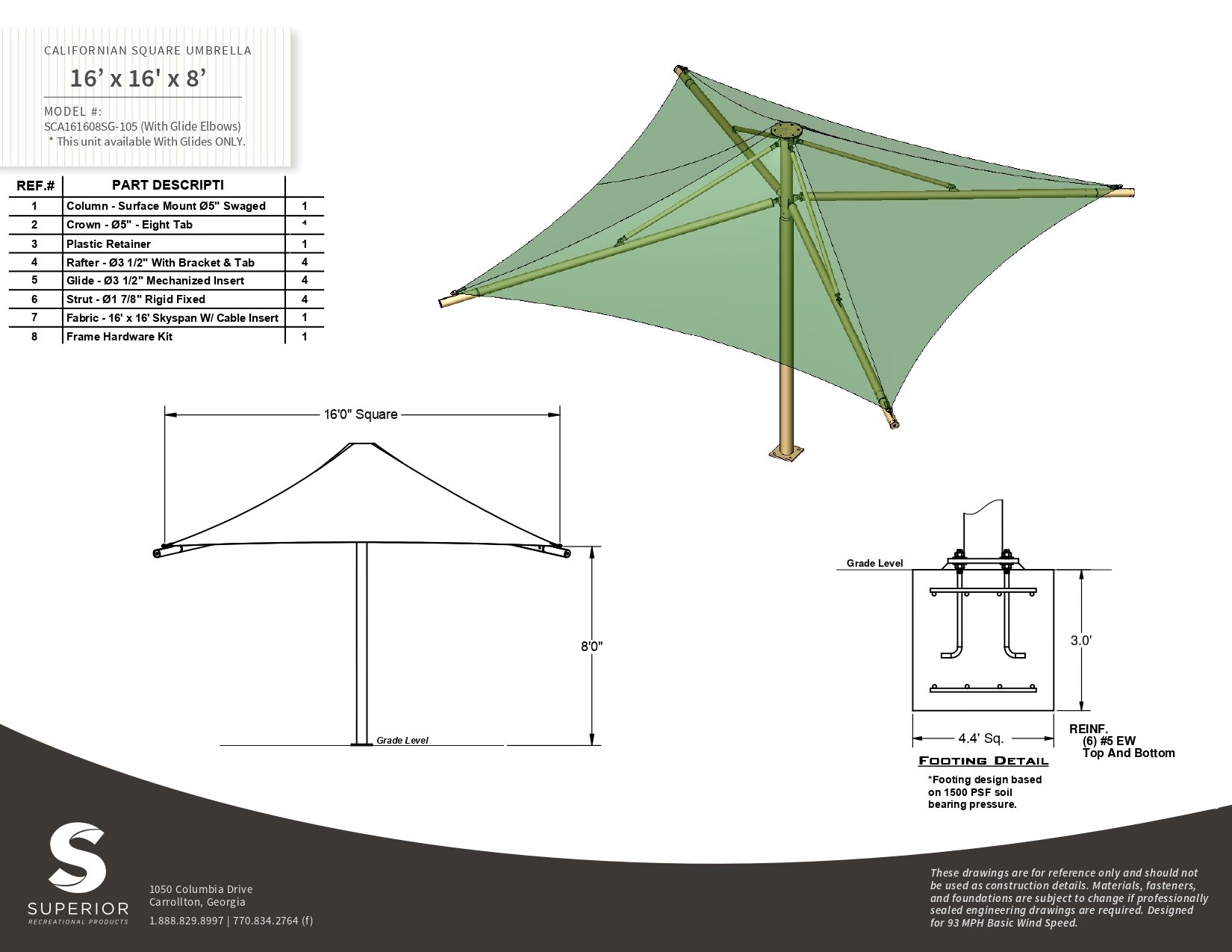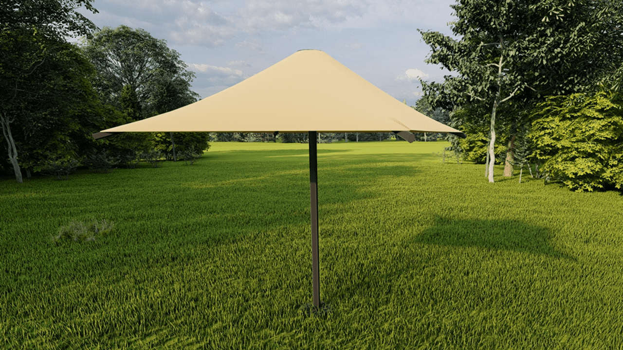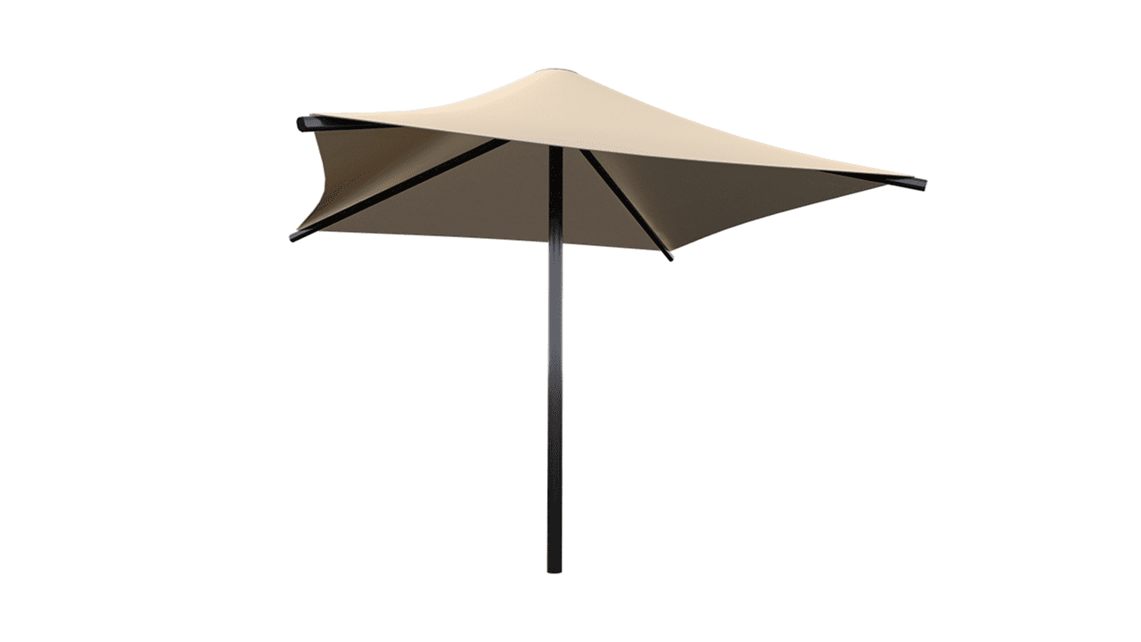 The single post Waterproof Umbrella is available in a square or hexagon shape. Our square outdoor umbrella may be purchased in a 13-foot or 16-foot size. All umbrellas are available in your choice of an 8-foot or 10-foot entry eave height. These commercial-grade umbrellas come with our Glide Elbow™ fabric removal attachment, which makes it faster to remove the fabric in the case of bad weather; this is especially convenient for areas that are frequented with damaging storms, snow, or high winds. What’s more, this umbrella is waterproof! It features our Waterproof Fabric, which propels water and keeps the space underneath the umbrella dry.