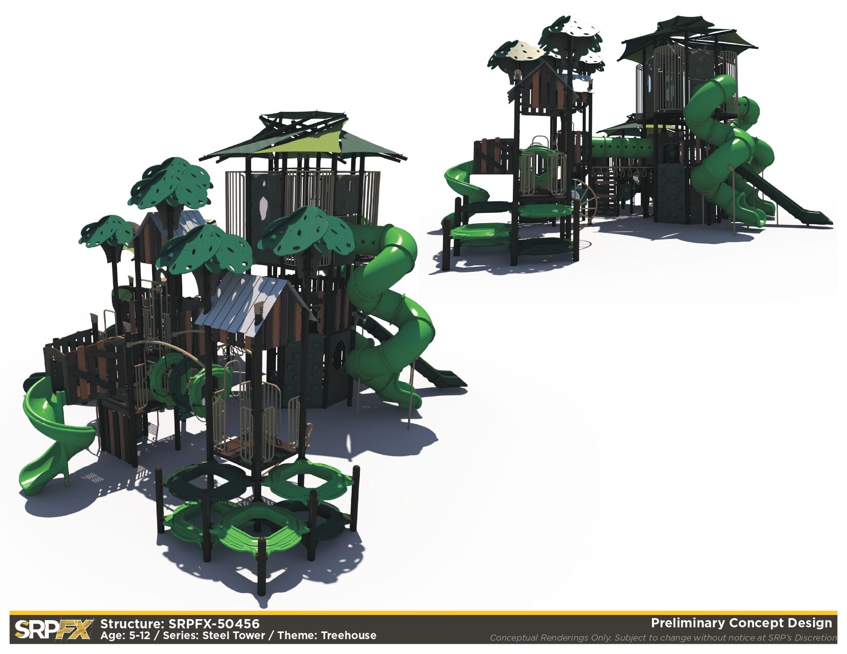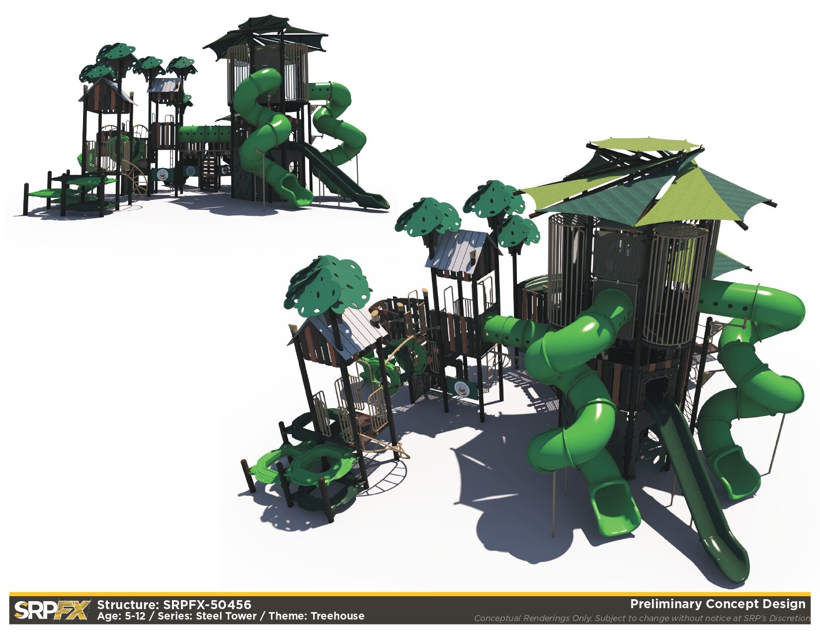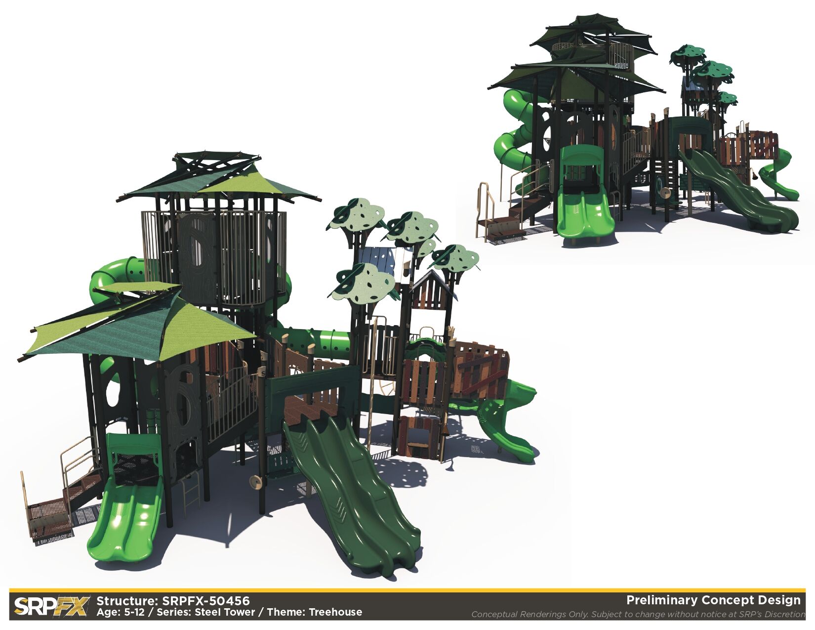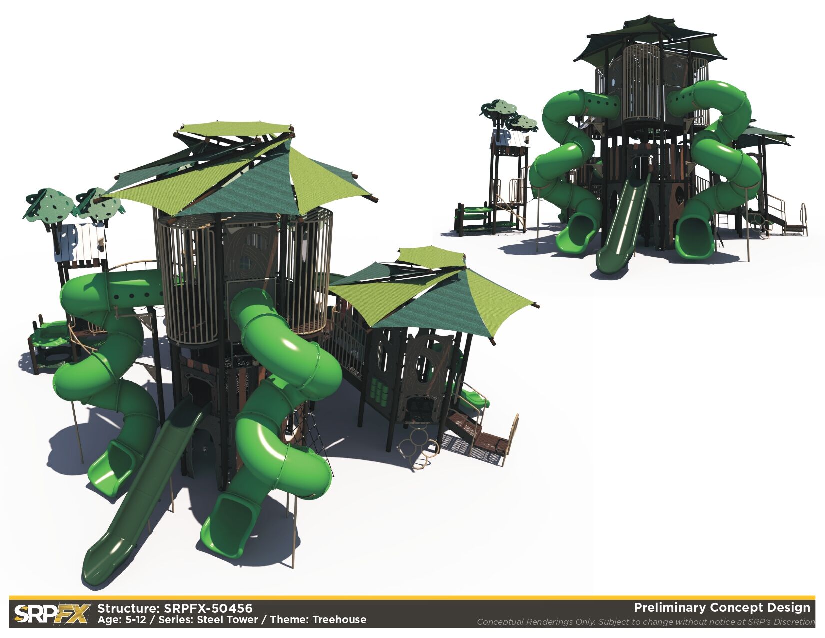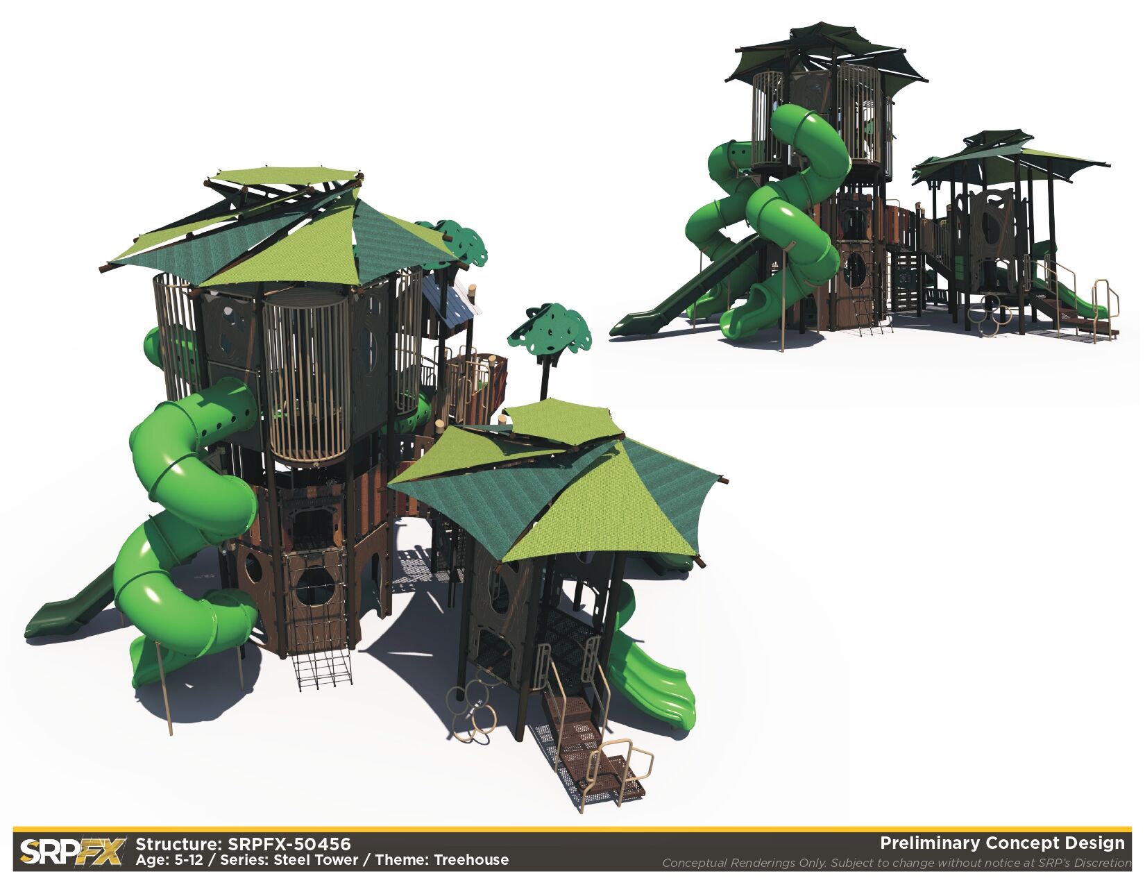 The SRPFX-50456 is a tower outdoor playground designed with age-appropriate components for children ages 5-12. It features two shaded tower sections connected with stairs. The many slides, climbers, and panels will add great play value to your outdoor playground.