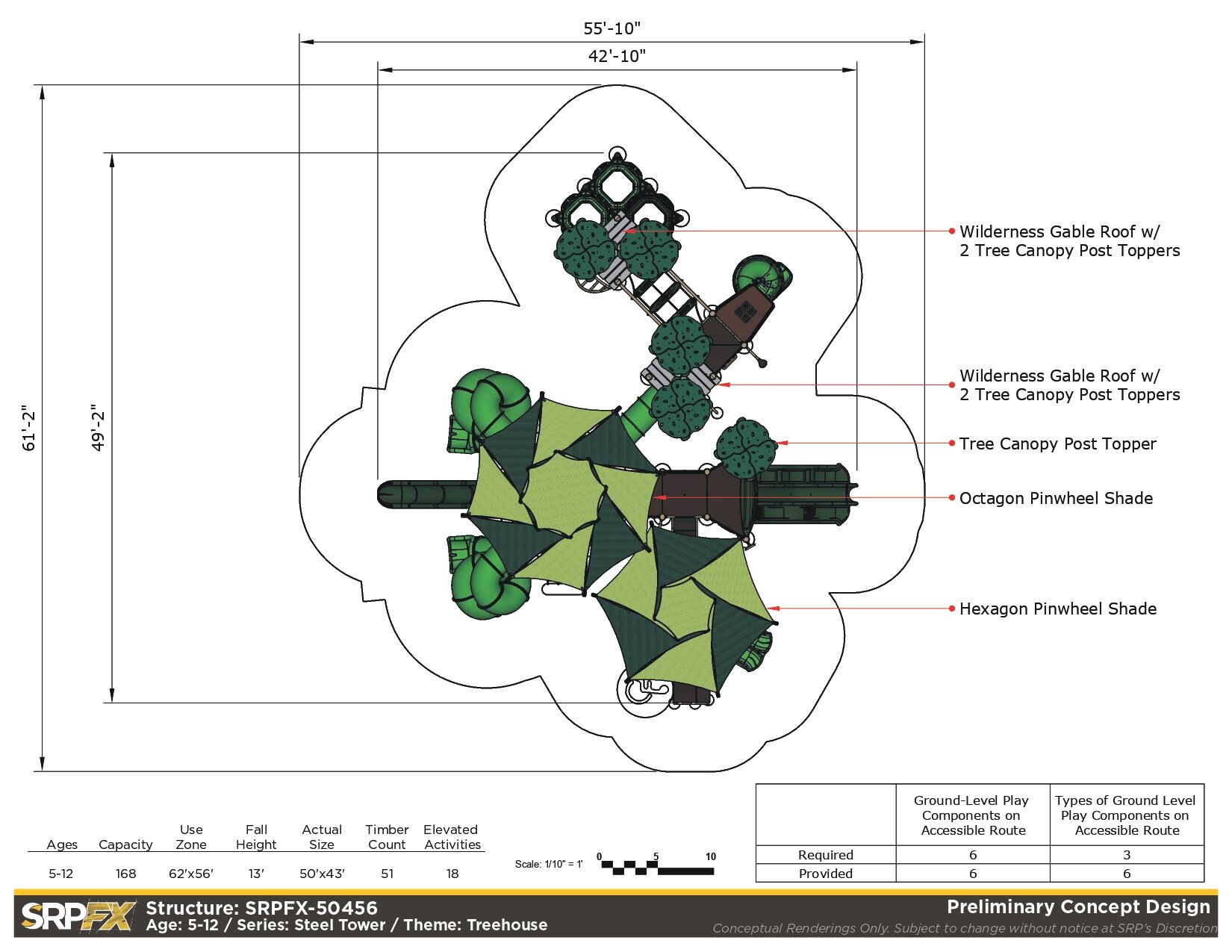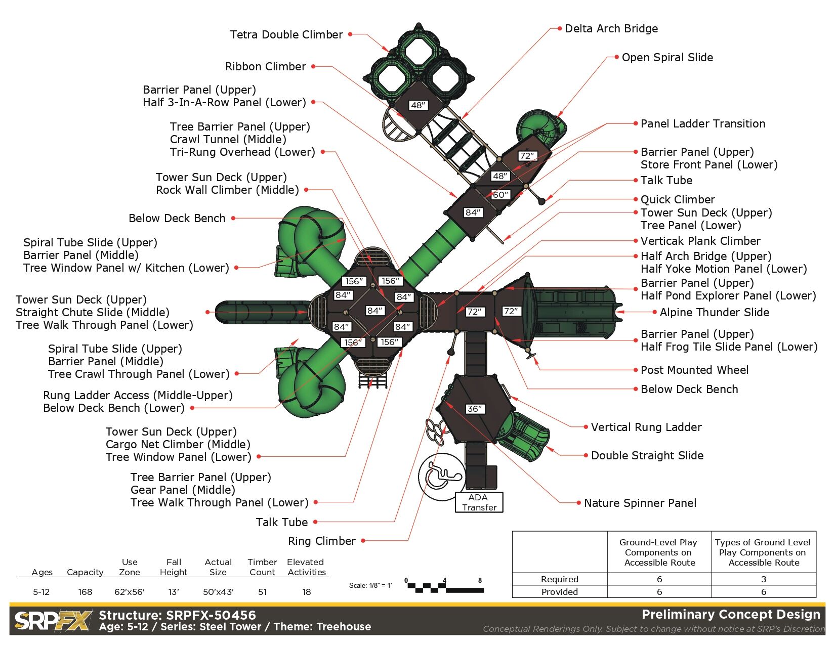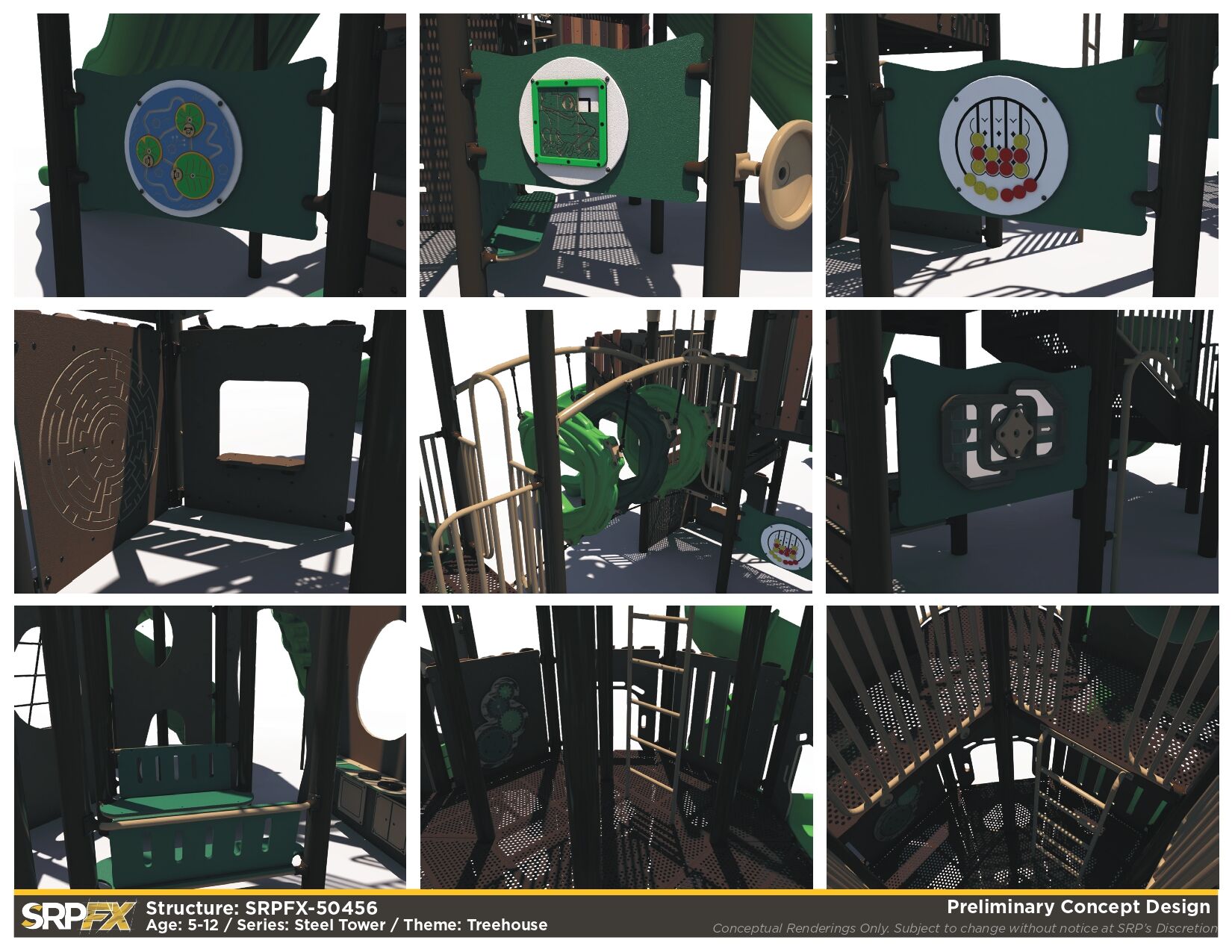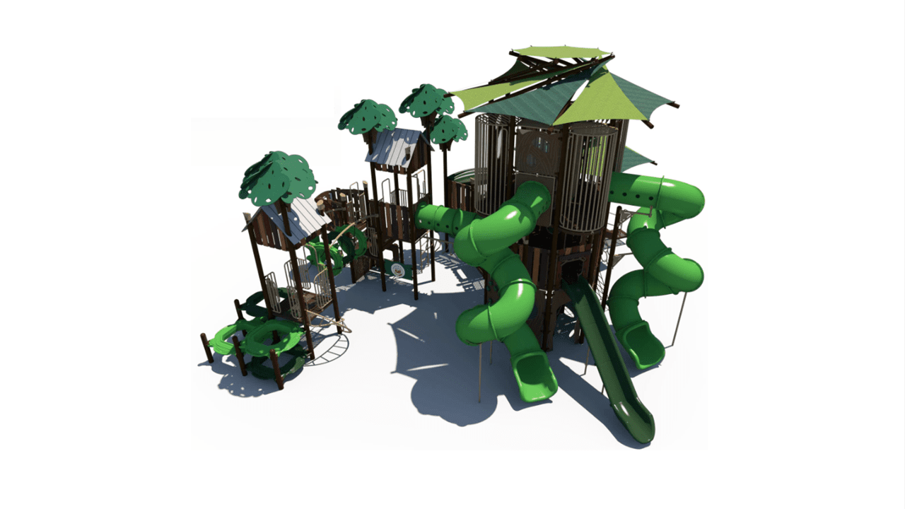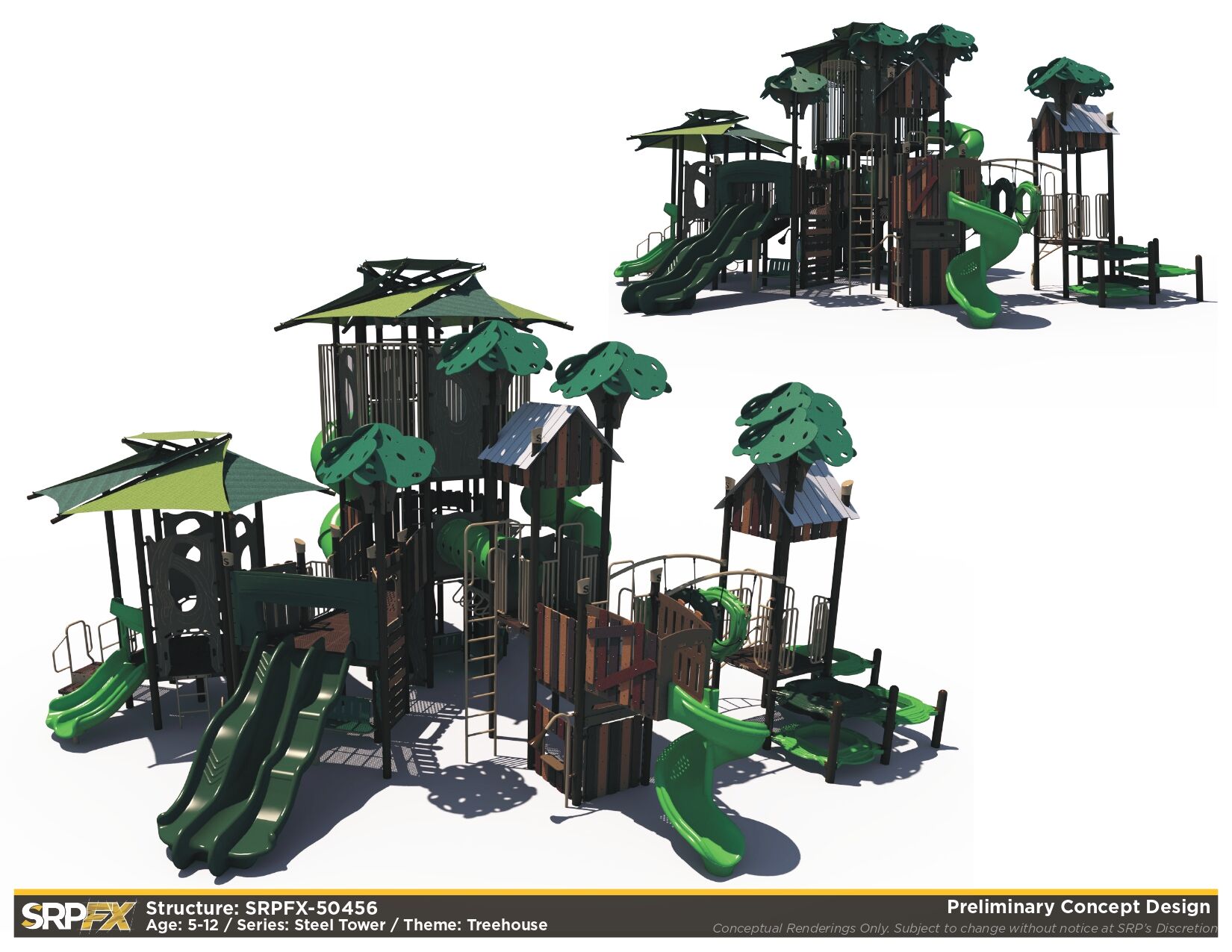 The SRPFX-50456 is a tower outdoor playground designed with age-appropriate components for children ages 5-12. It features two shaded tower sections connected with stairs. The many slides, climbers, and panels will add great play value to your outdoor playground.