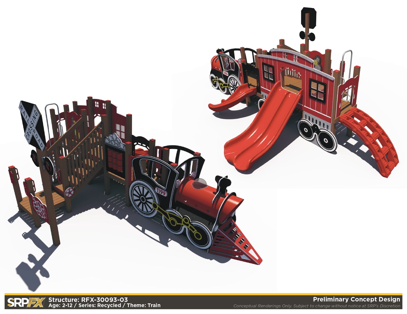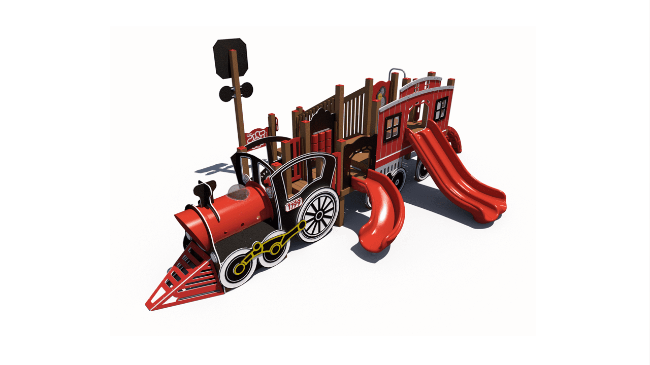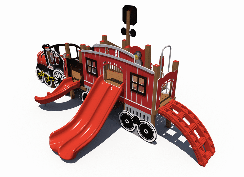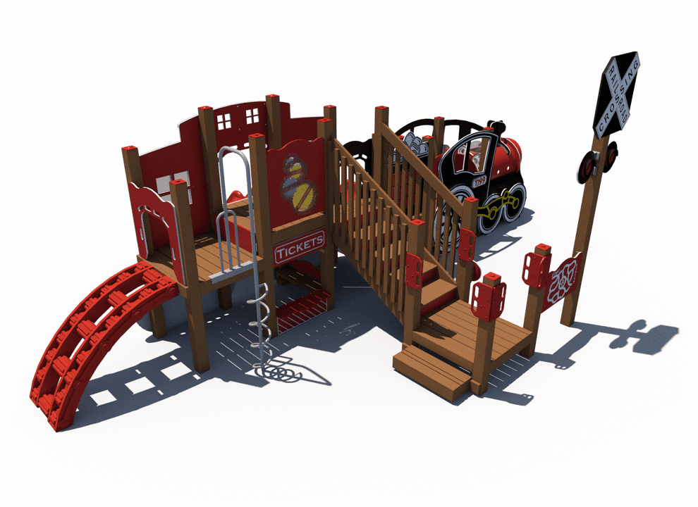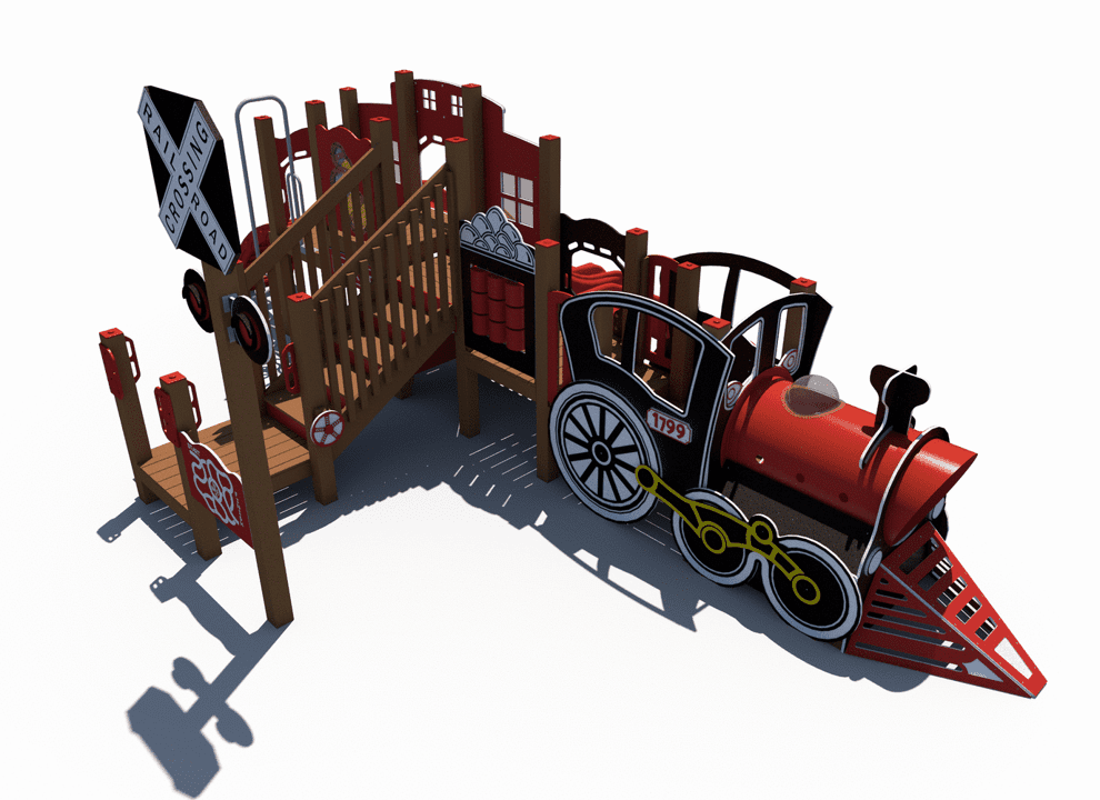 All aboard the Train Themed Playground! Our R3-20160 is the larger sister structure to our R3FX-30002 Steam Engine. This structure is the perfect addition to any train-themed playground and, unlike our Steam Engine, features a caboose! This highly detailed recycled structure, designed for children aged 5-12, is sure to impress and encourages children in the areas of physical and dramatic play.