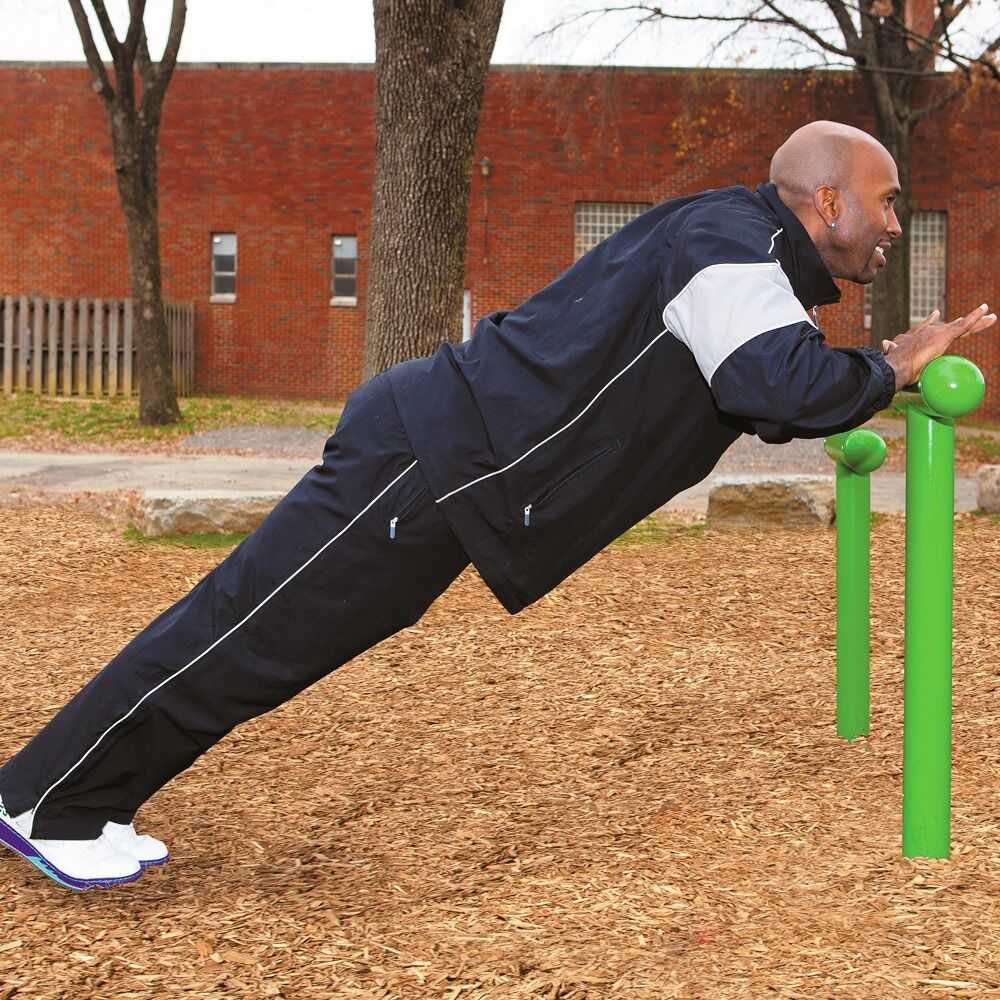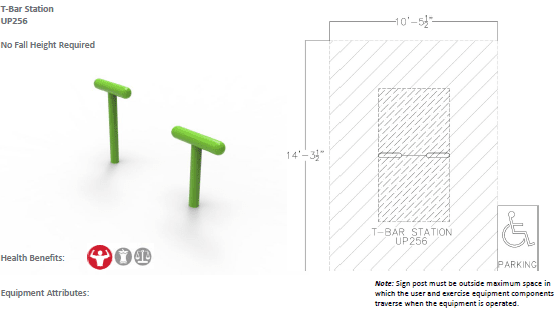 The T-Bar Station provides a full body strength work-out as the user slowly moves through plank positions. Designed for ages 13 and up.