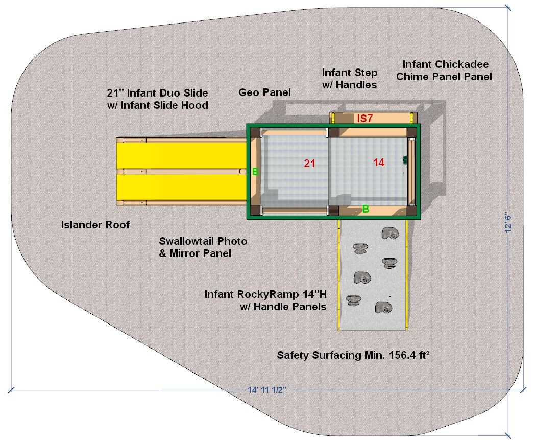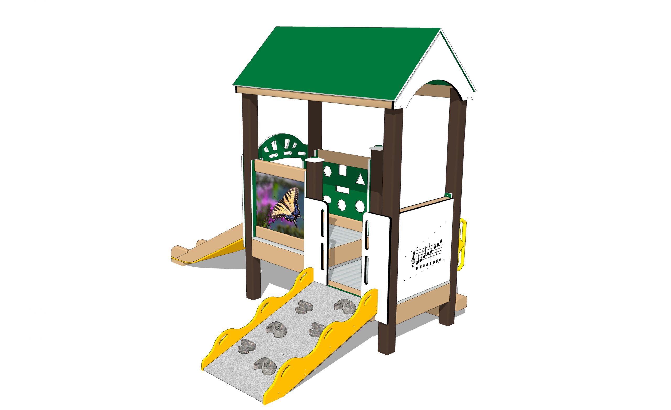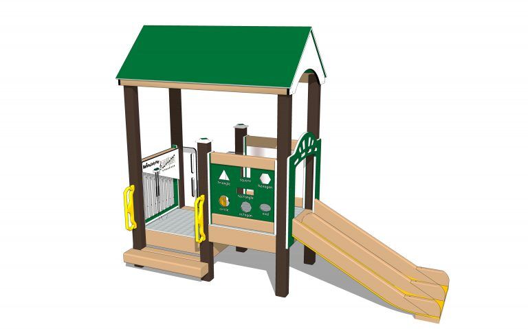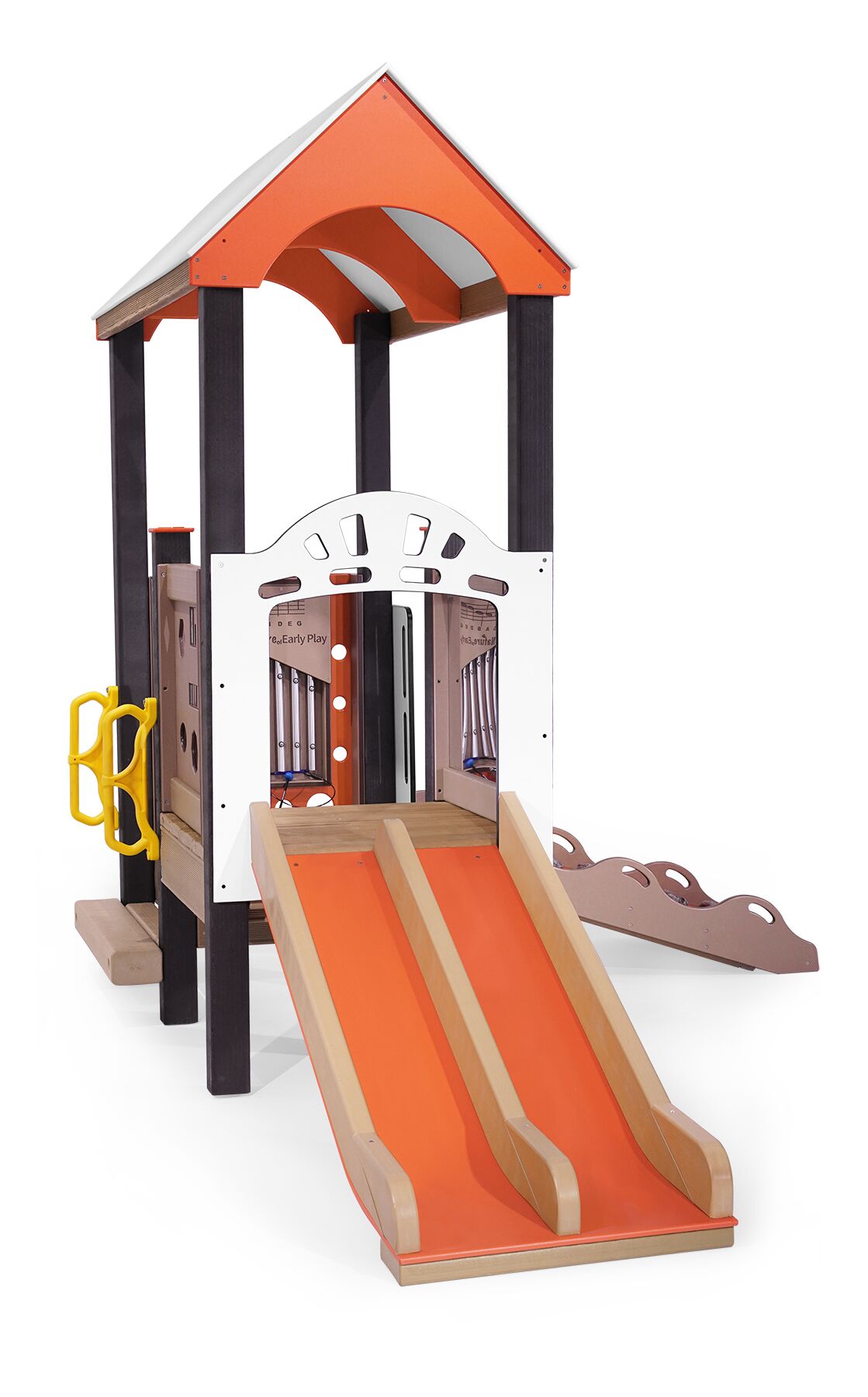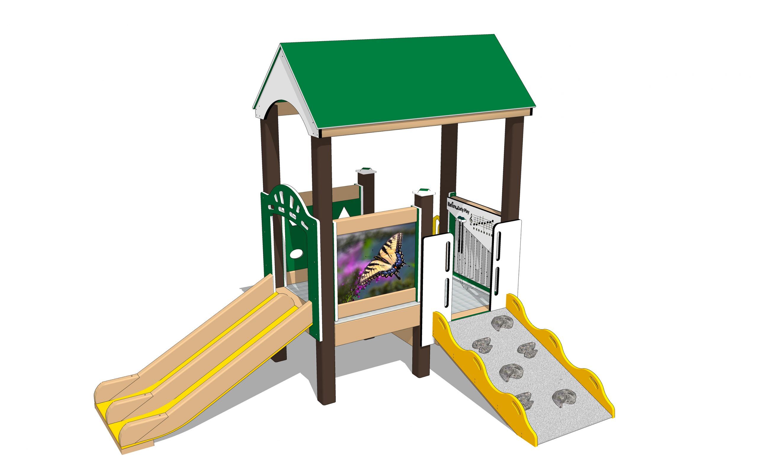 The Tiger Swallowtail infant and toddler playset is perfect for smaller children and smaller playgrounds. Babies will love the infant sized climbers, decks, slides and chime panel. Infants and toddlers will develop large and small muscles while climbing the Rocky Ramp and balance going down the infant slide.
