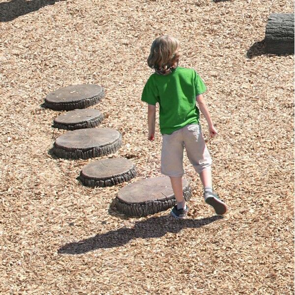 Create a path for children to follow. Hop, step, jump! These playground steppers were inspired by nature and are artfully designed and hand painted to resemble real slices of wood. The Tree Slices are constructed of durable glass fiber reinforced concrete (GFRC) and are suitable for ages 2-5 or 5-12. Set includes 5 Tree Slices.
