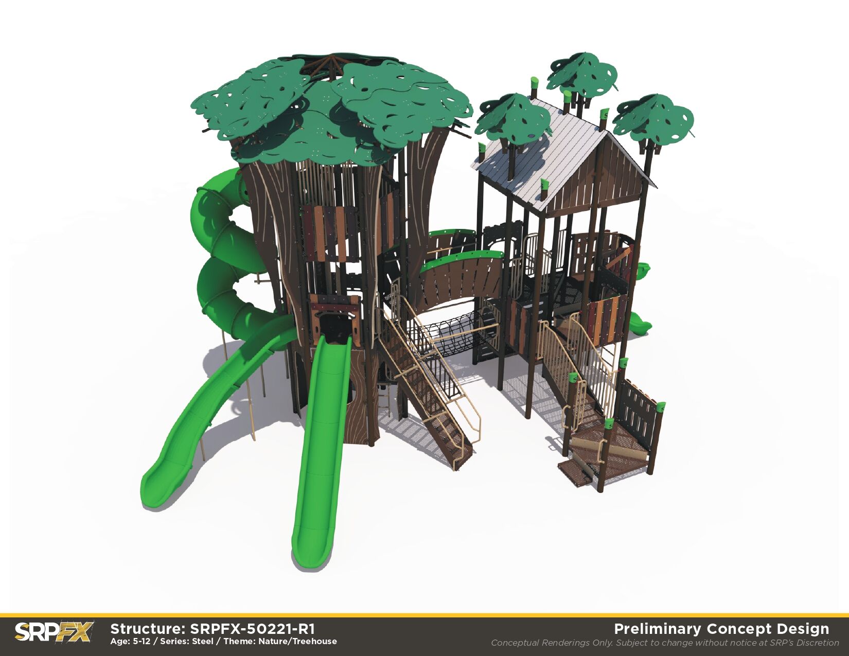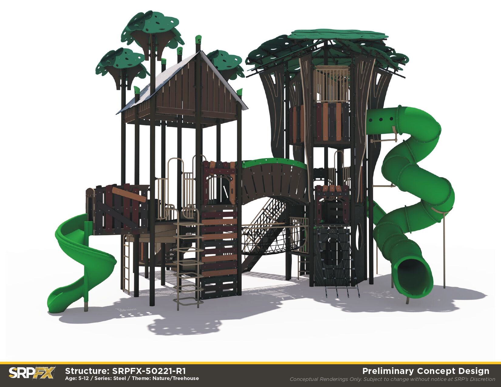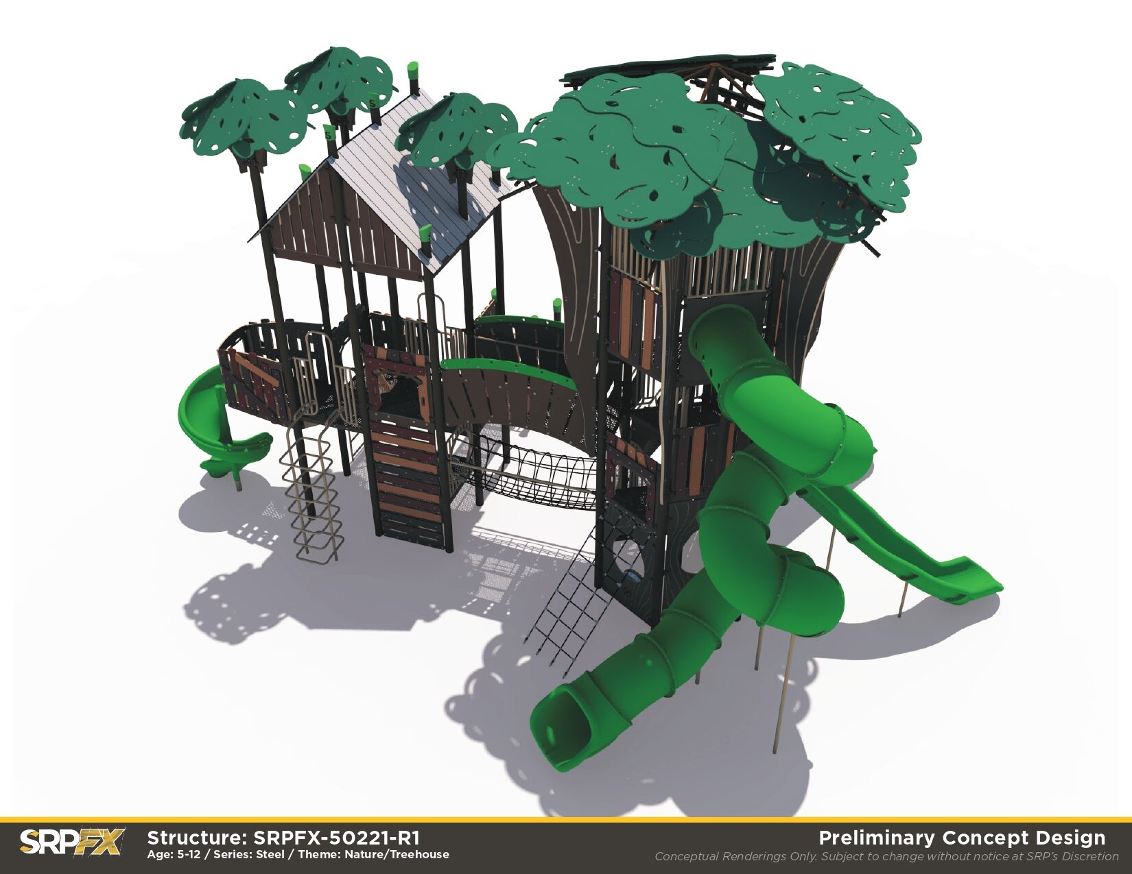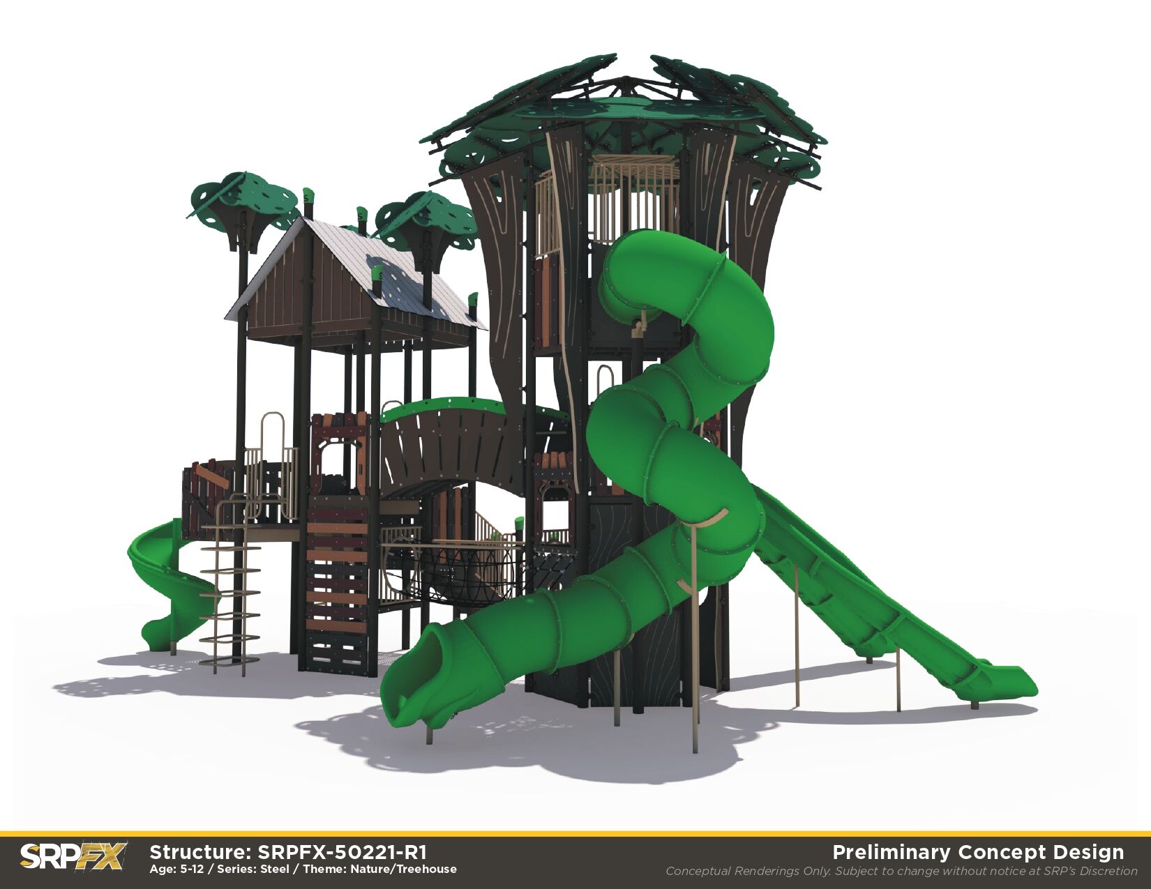 Our steel Treehouse Themed Playground makes a great addition to any park, school, or other play space. We’ve purposefully designed leaf post toppers, trunk panels, and more to give this structure the magic of imagination. Children will have fun exploring the many slides, climbers, and panels found within this treehouse play structure.
