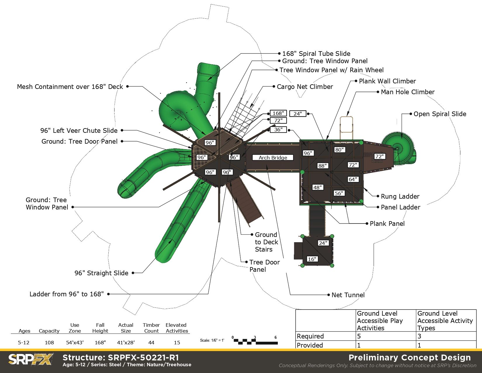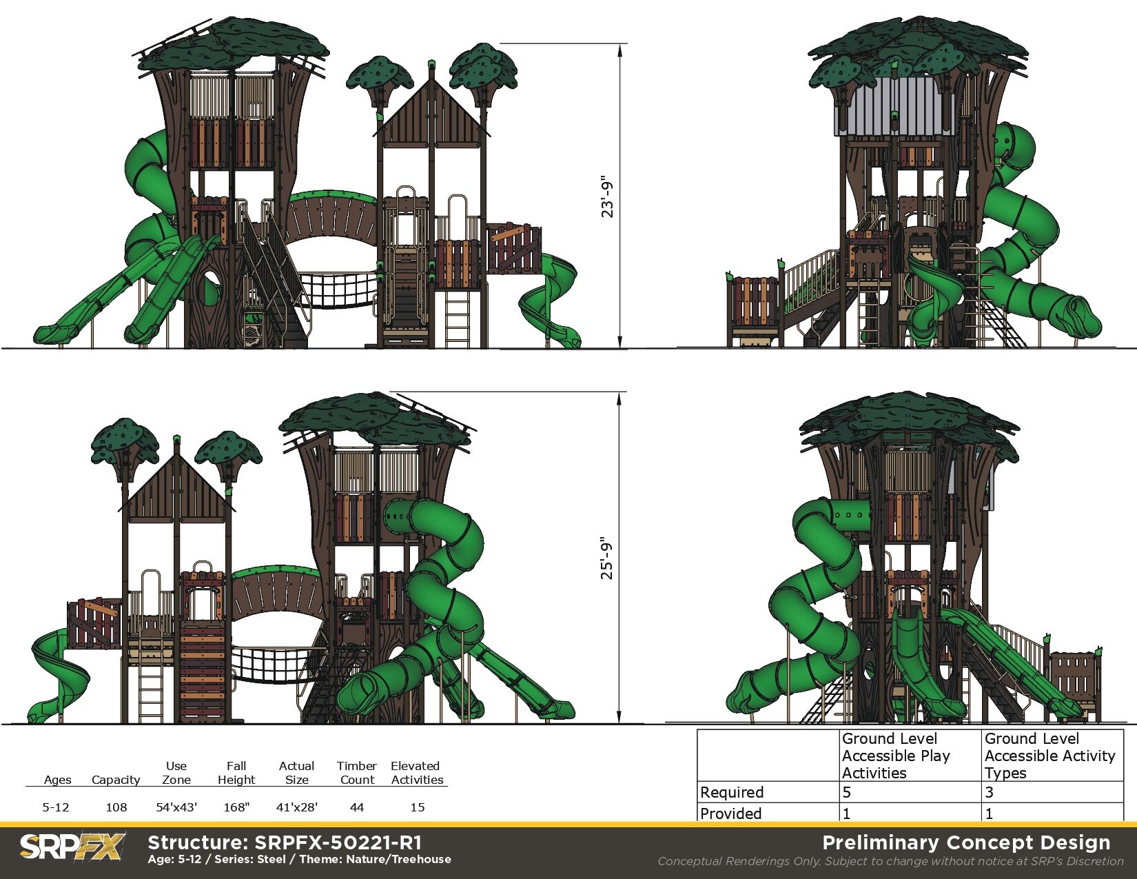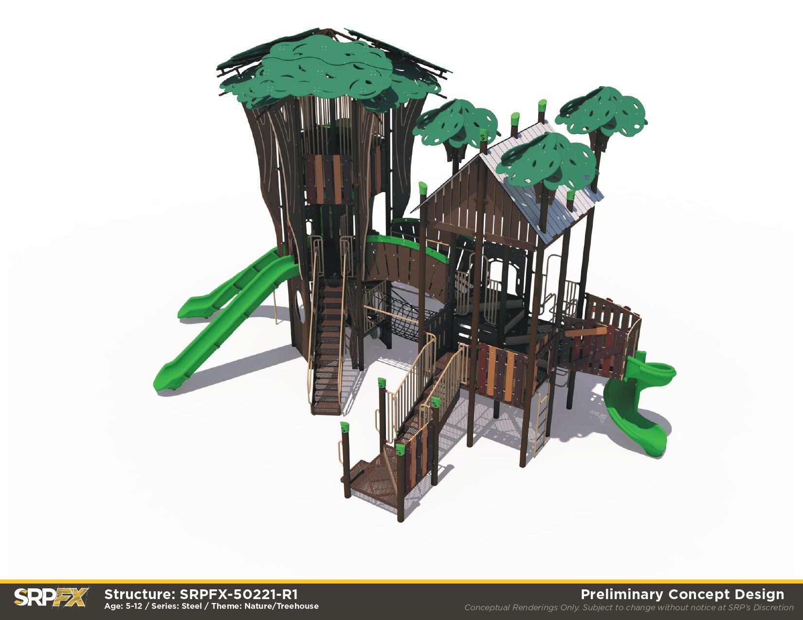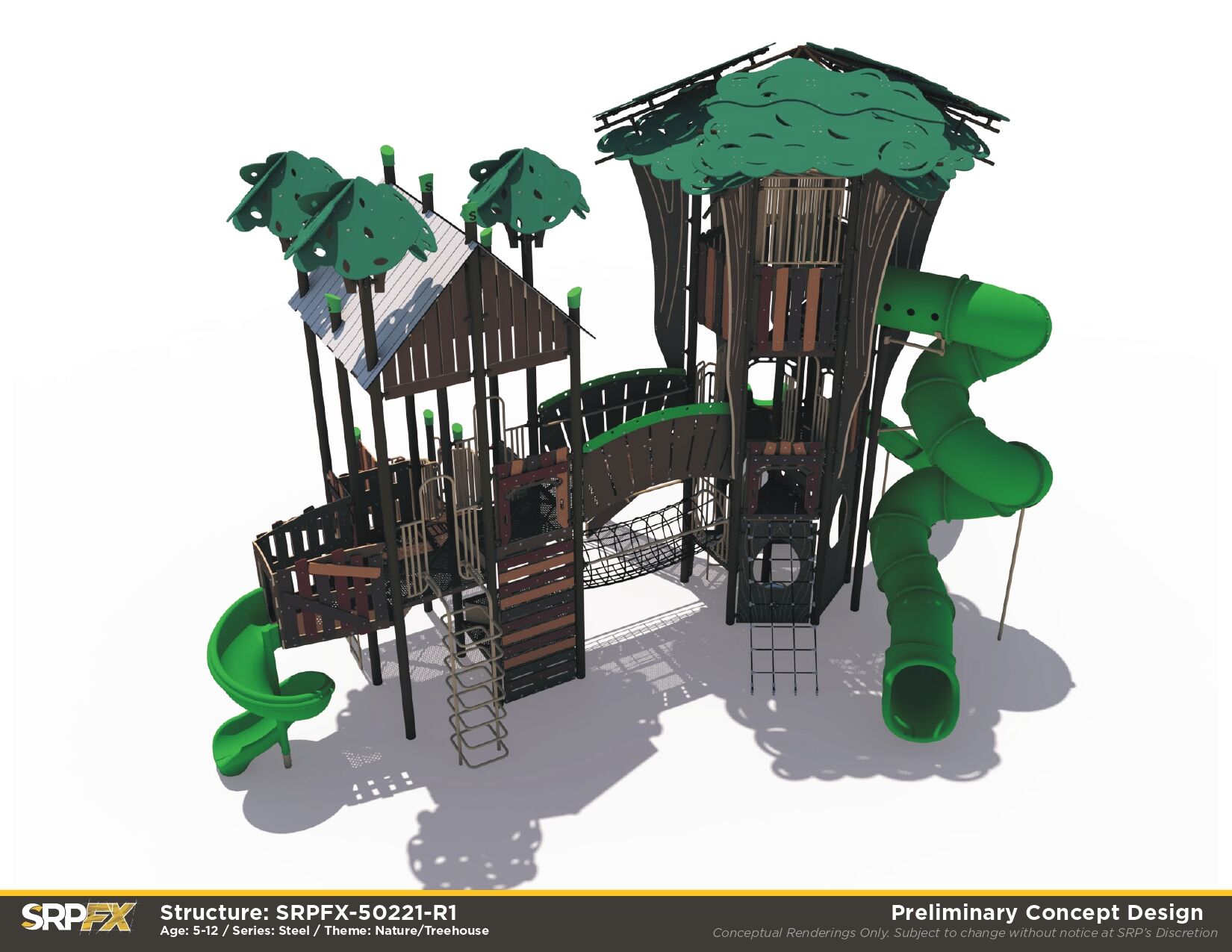 Our steel Treehouse Themed Playground makes a great addition to any park, school, or other play space. We’ve purposefully designed leaf post toppers, trunk panels, and more to give this structure the magic of imagination. Children will have fun exploring the many slides, climbers, and panels found within this treehouse play structure.