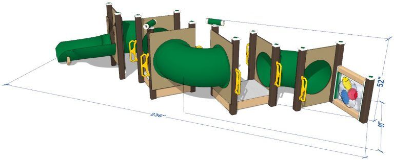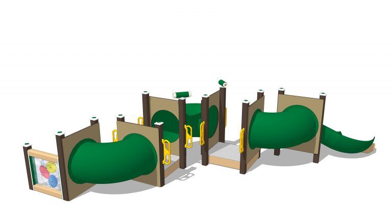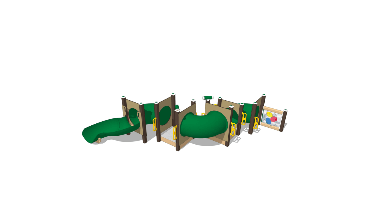 At one end of the set, an interactive gear panel stimulates their curiosity and develops their coordination. At the other end, a Curvy Chute Scrambler helps to build strength and balance. Along the way, two of our exclusive Teleidoscopes invite tots to scan the horizon.