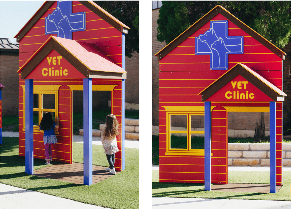 The Vet Façade is for dramatic play. It can function as a standalone item or be part of a village. See our other Facades to design an entire village. We can even customize names and logos!