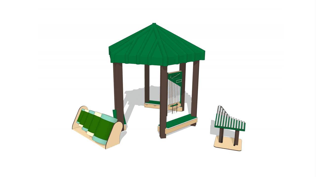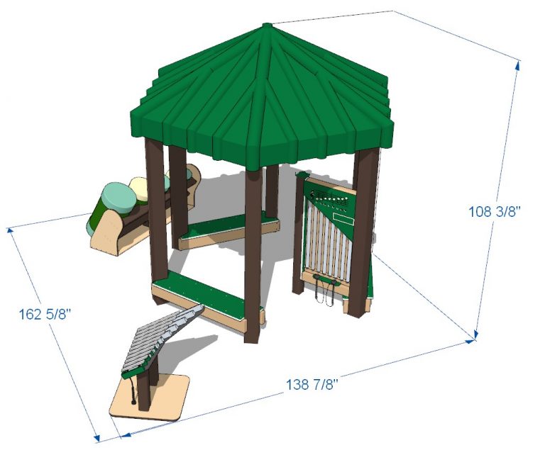 The Wee Jammin’ Gazebo sports a hexagon roof to shelter playground jam sessions. The Nature of Early Play Wee Jammin’ Gazebo includes three attached benches, Mini Chime Panel, Tuned Drums on Stand, and Merry Weenote instrument. Hex Gazebo is also available with 3 Benches. Bring music and shelter to your children’s play area.