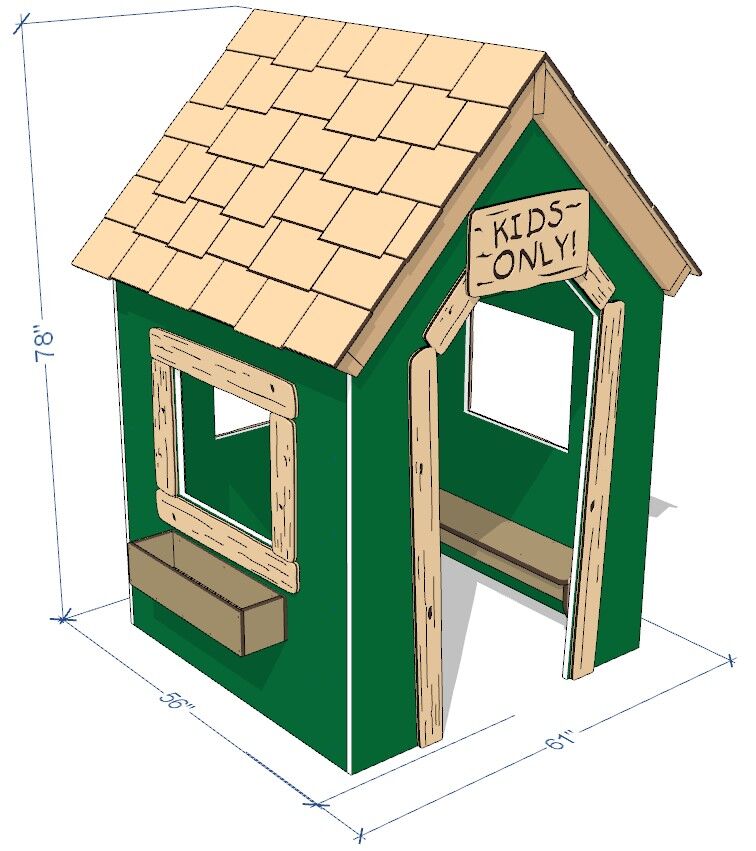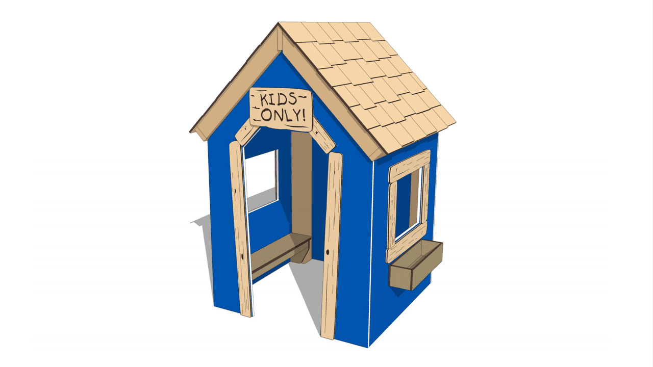 The Wee Tots Clubhouse includes two benches along the inside walls, a doorway, three windows with planter boxes, and a requisite Kids Only sign above the door.