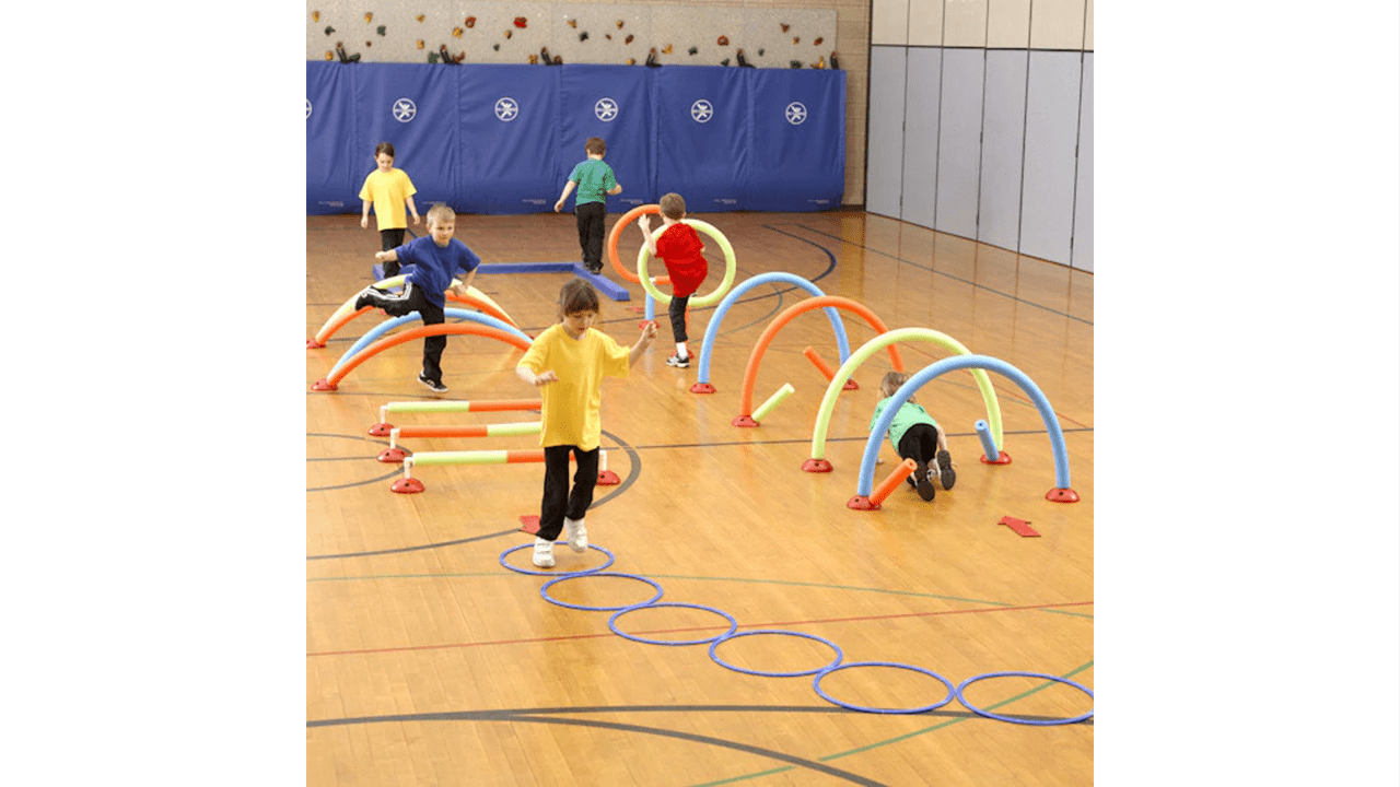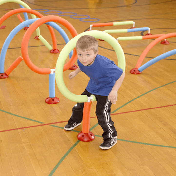 The WeeKidz® Challenge Course set includes 20 red bases, 10 long noodles, 8 medium noodles, 11 small noodles, 3 balance beams, 6 rings, 50-4″ connectors, 6 L-connectors, 5 T-connectors, 6 curved rubber directional arrows, 4 straight rubber directional arrows, storage bag and detailed activity guide with course maps, lesson plans and assessments.
